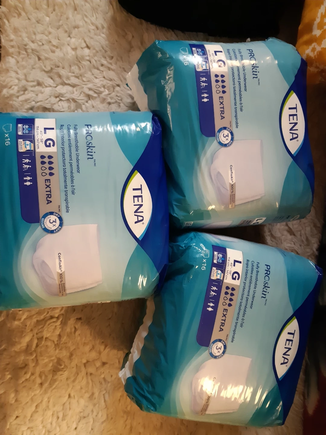 This is a 3-pack of TENA ProSkin underwear in size Large Extra. They're fully breathable with ConfioAir technology. Each pack contains 16 pairs.