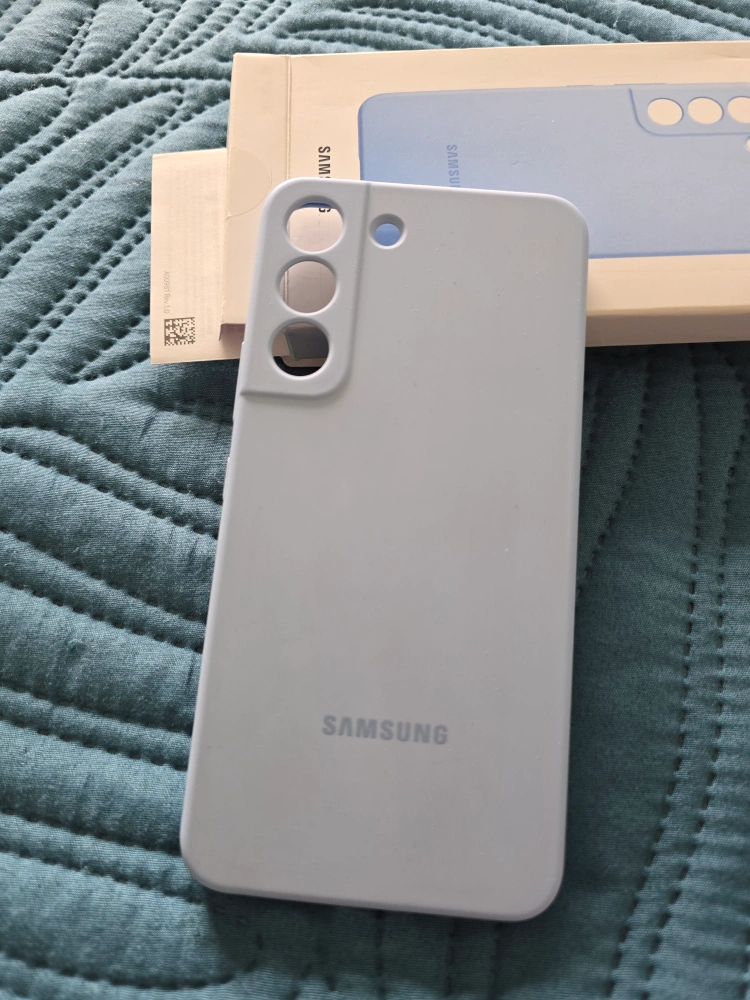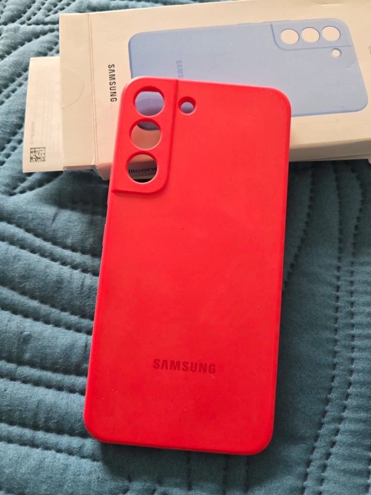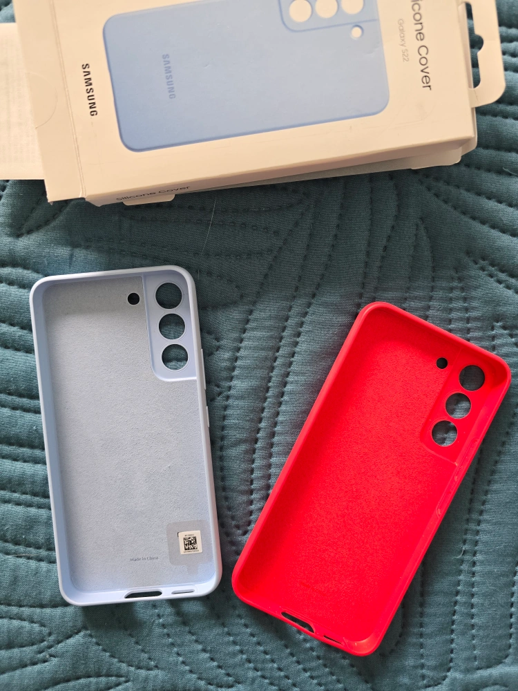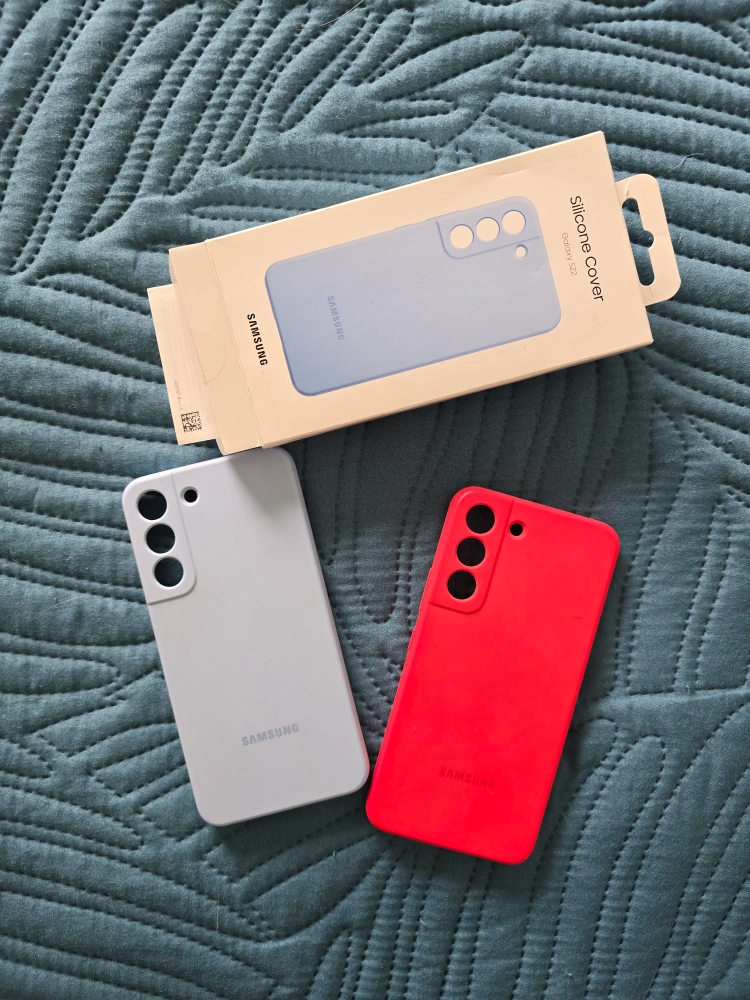 Two brand new original Samsung Galaxy S22 silicone phone covers. One light blue, one red. Protective and form-fitting. Sold together.