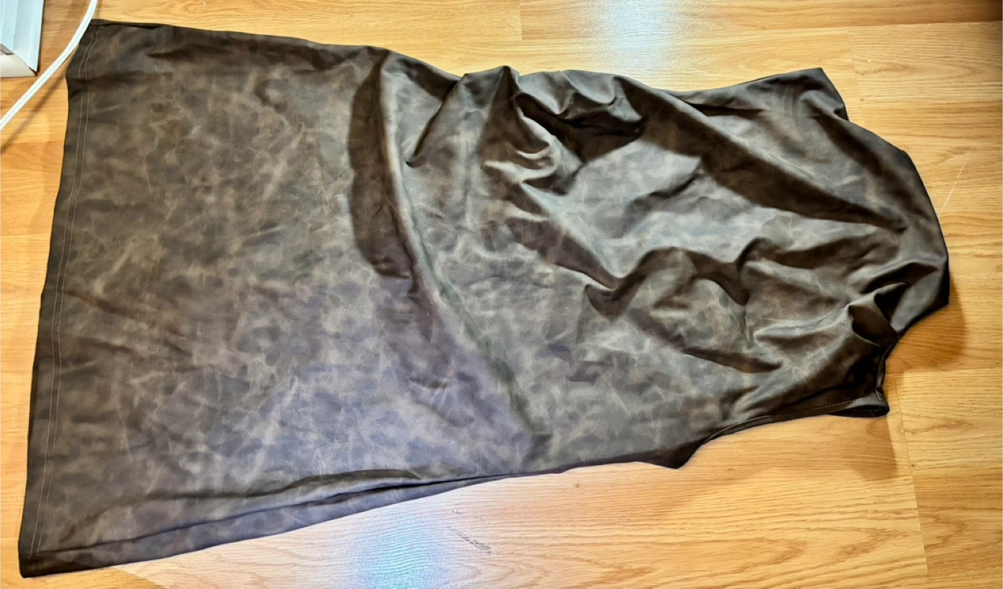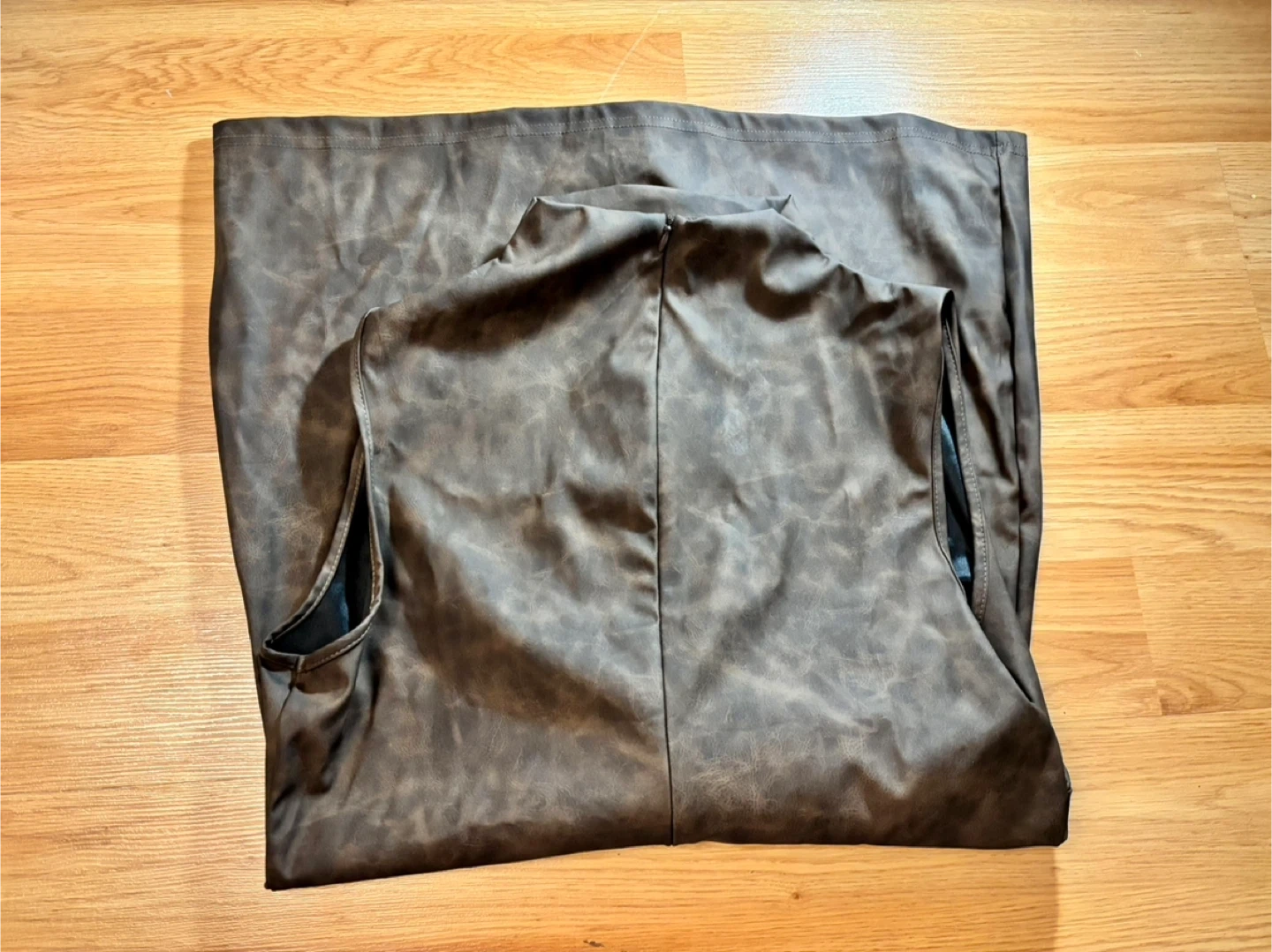 Brown faux leather dress with a unique distressed finish. It's a stylish and versatile piece for any wardrobe. Material is likely polyurethane or a blend.