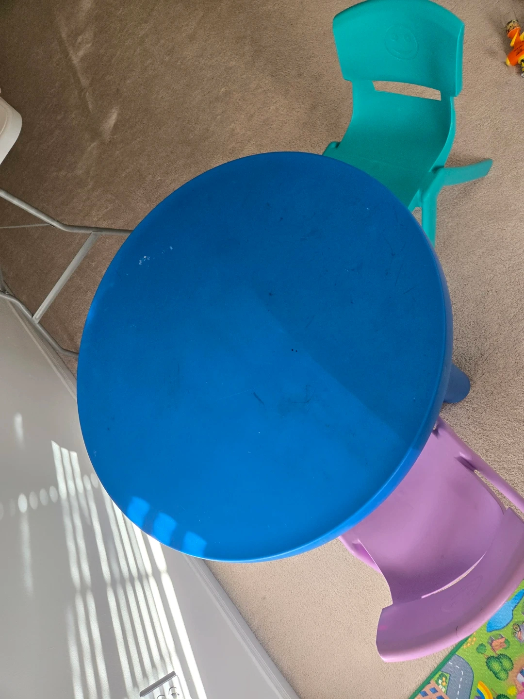 Selling a cute kids' table and chair set! It comes with a blue round table and two chairs, one teal and one purple. Perfect for arts and crafts or snack time!