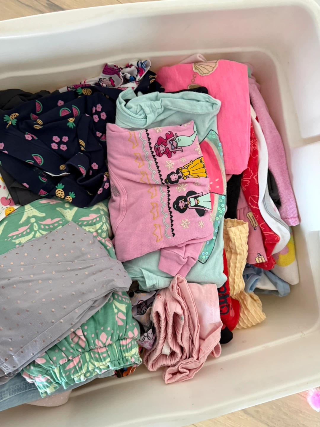 Bundle of assorted toddler girls' clothing. Includes tops, leggings, and more. Assorted sizes and designs. A few items 18-24 months ,Size 2 and 3. Pj’s, shorts, shirts, leggings that go above the ankle, jean over alls, swaddle blanekts and a fur blanket.