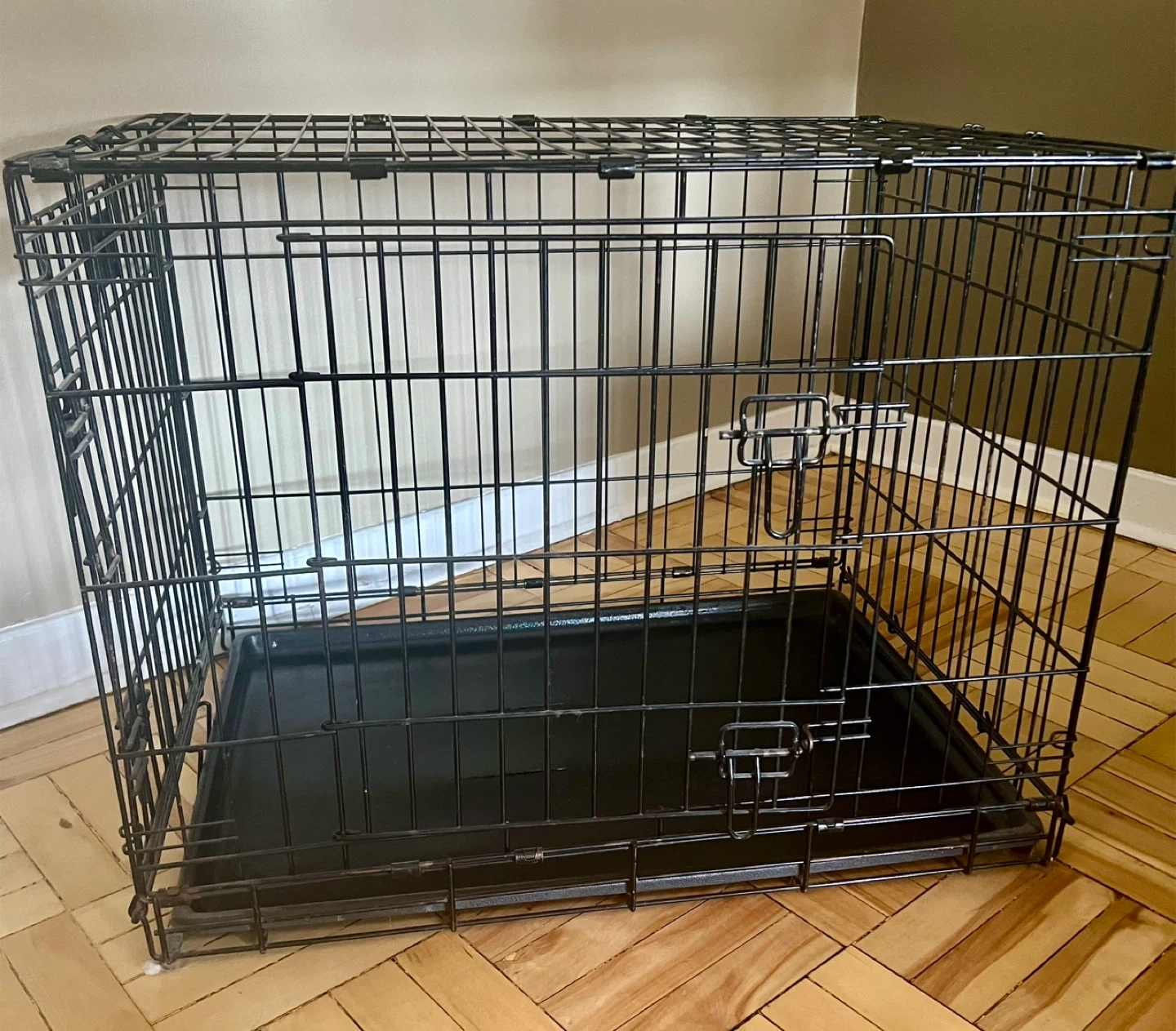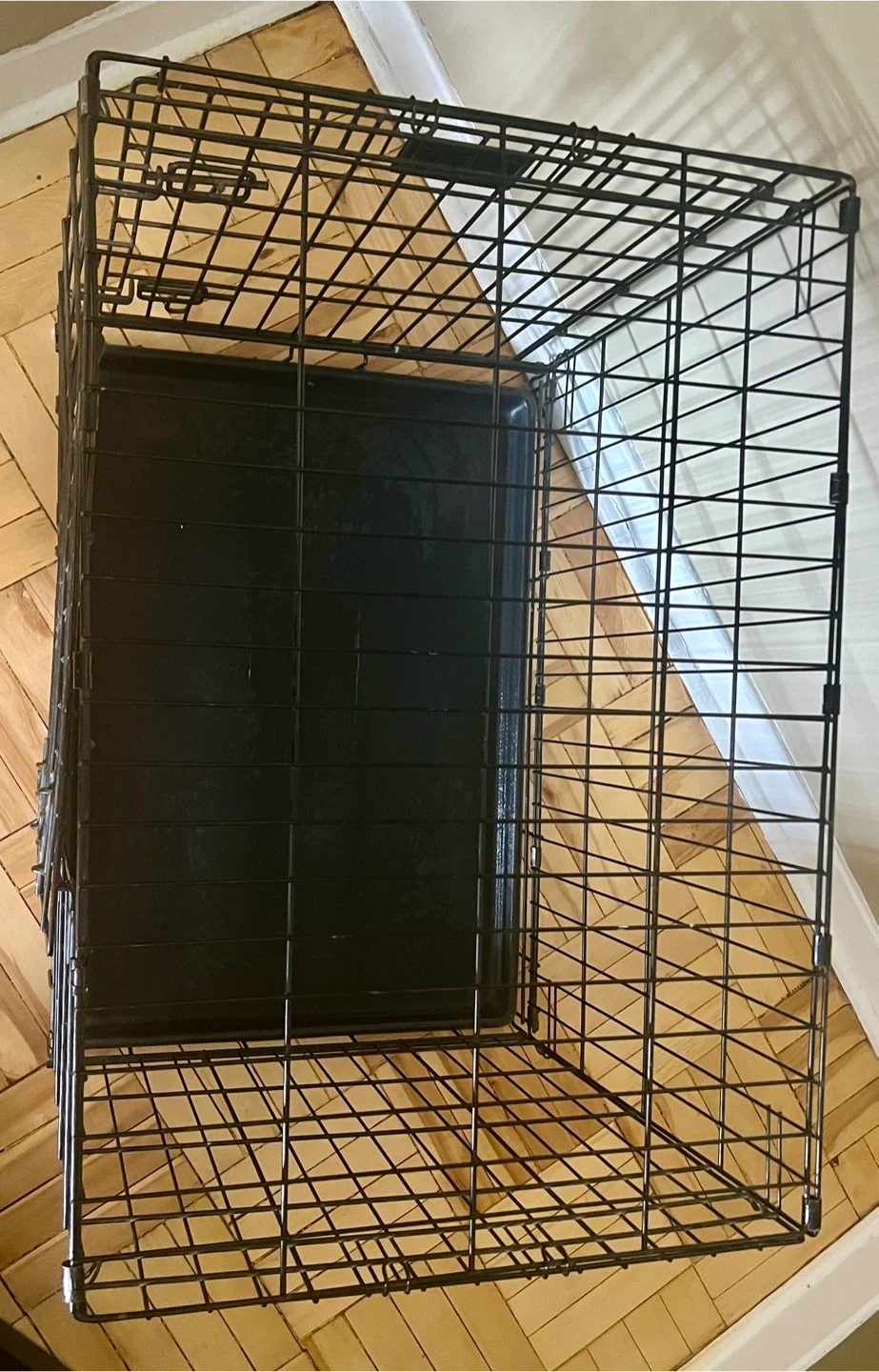 I'm selling a large dog crate, ideal for medium to large breeds. It offers a secure and comfortable space for your furry friend. The crate features a durable metal constructiont, a removable plastic tray for easy cleaning, and a front and side door with a secure latch. Perfect for training, travel, or providing a den-like space at home. the crate is fully functional and sturdy.