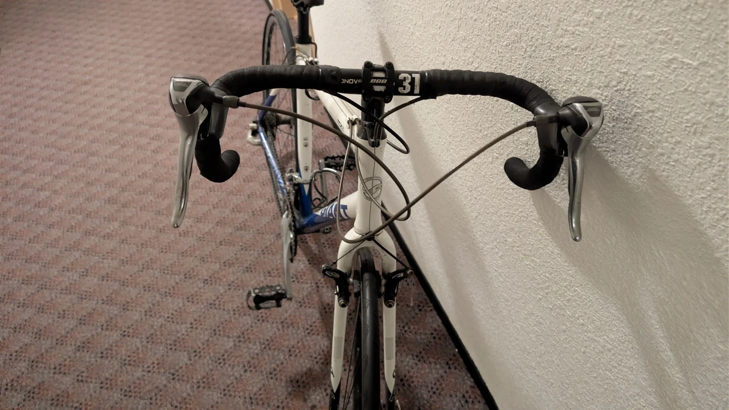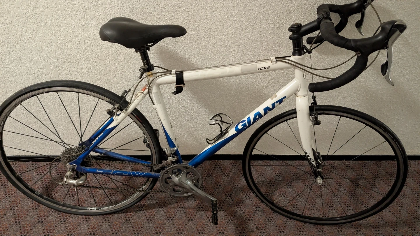 White and blue Giant TCX road bike with drop handlebars. Lightweight aluminum frame with carbon fiber forks. SRAM Rival derailleur. 700 X 35c Kenda tired. Giant P-R2 rims. AVID Shorty 6 brakes.