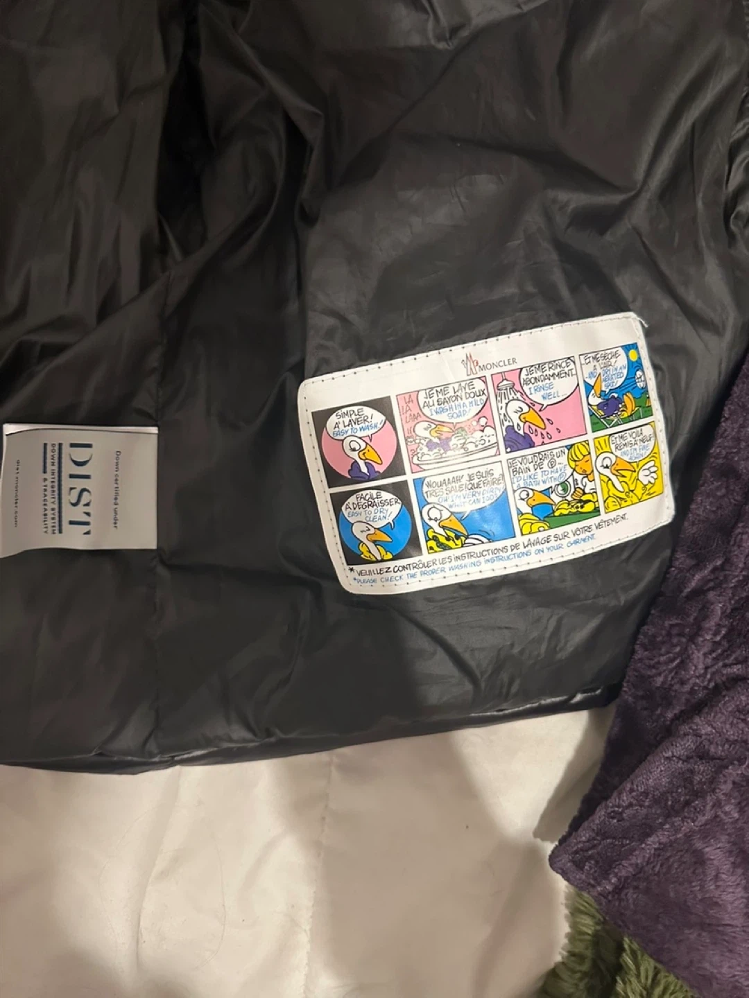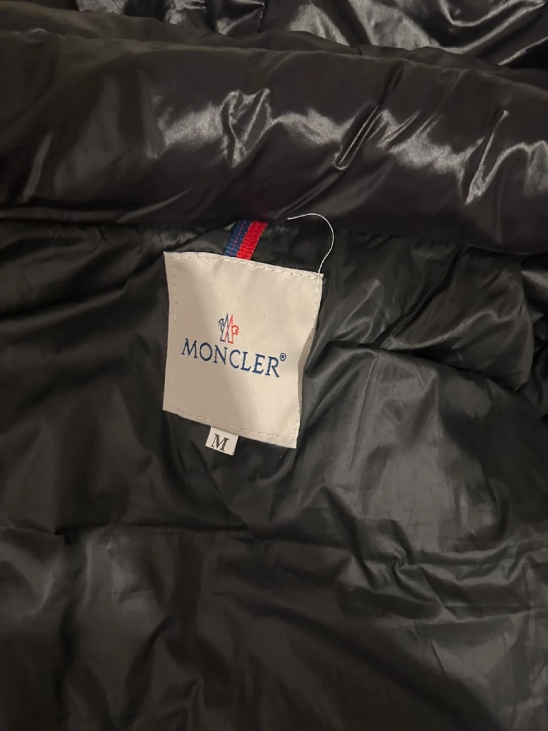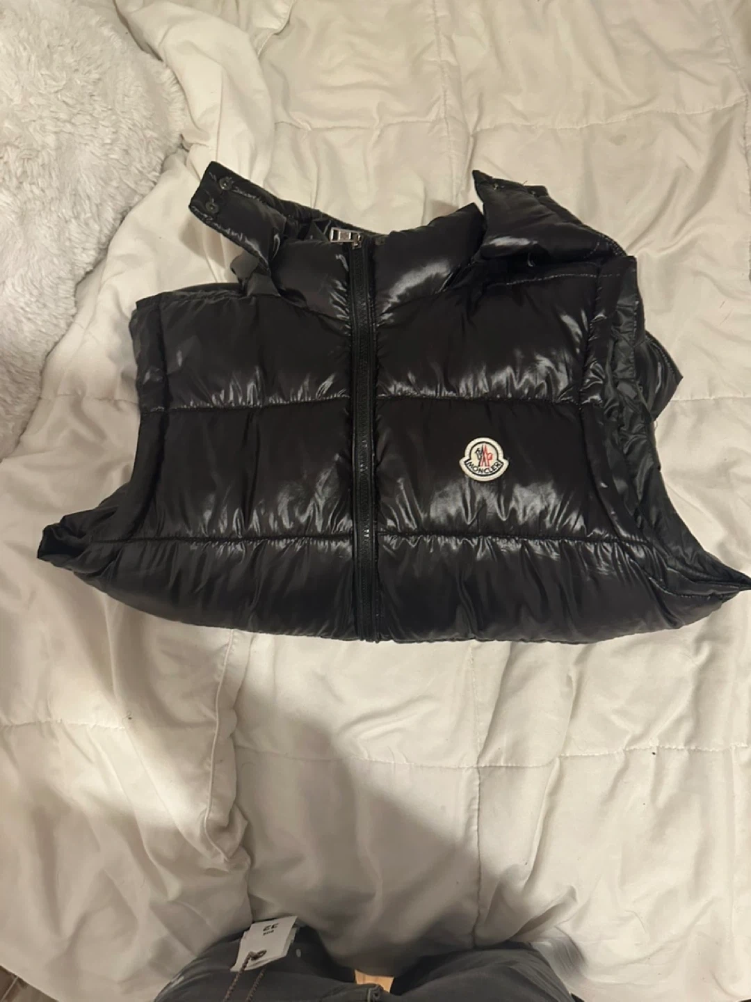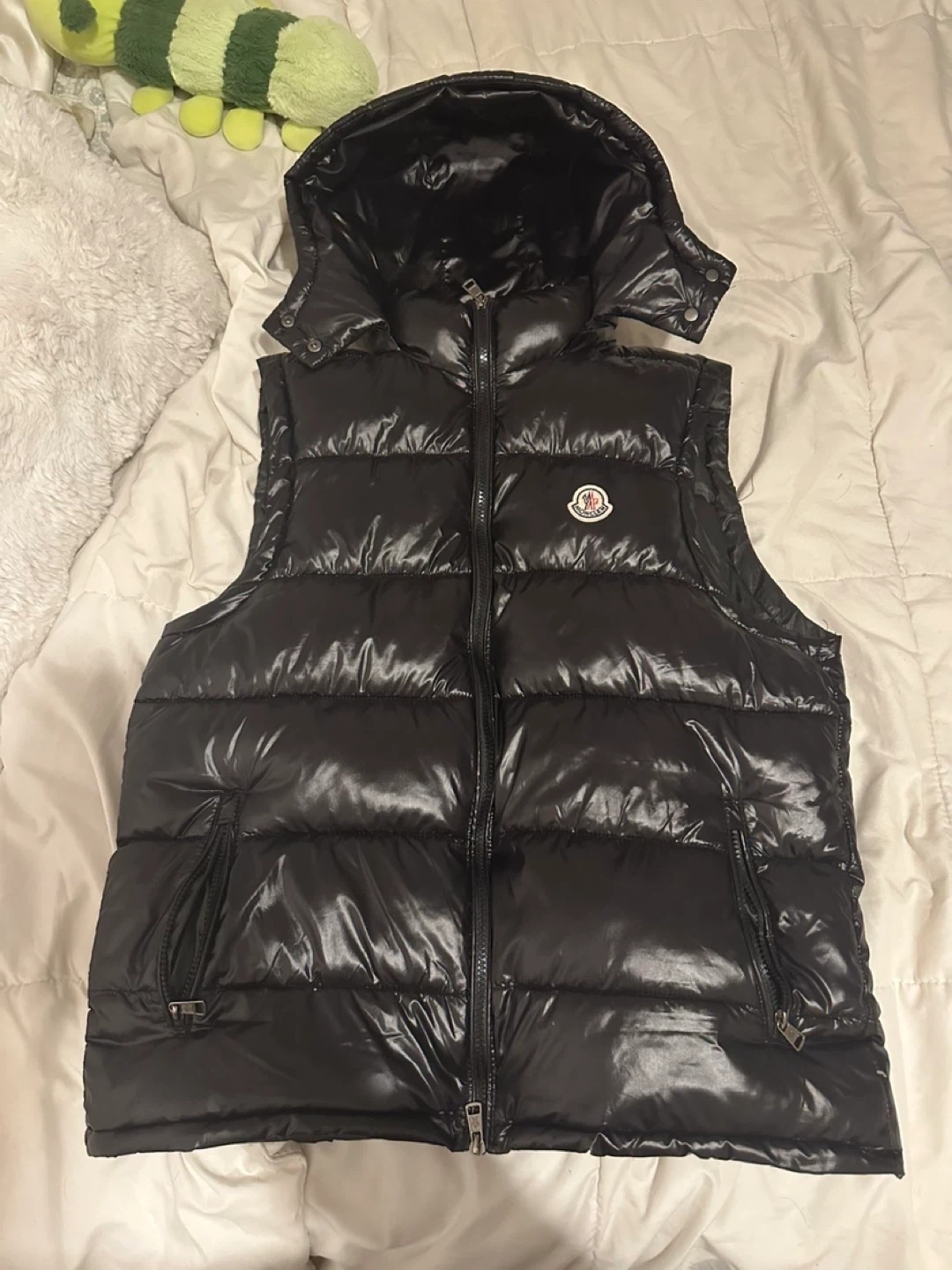 This is a black Moncler puffer vest. It's a size medium. Features a shiny nylon exterior and a hooded design.