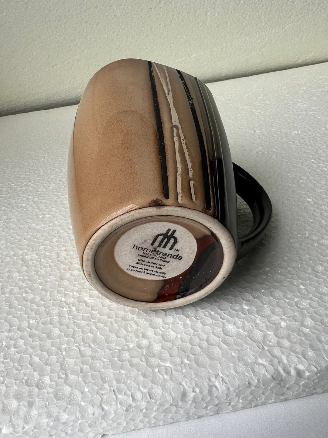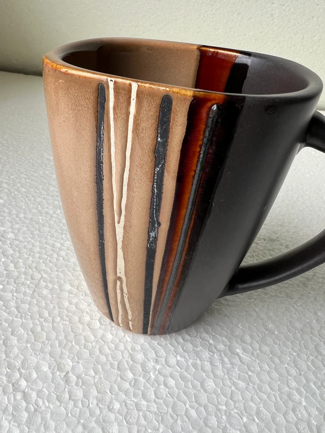 The mug features a unique design with brown, black, and white colours.