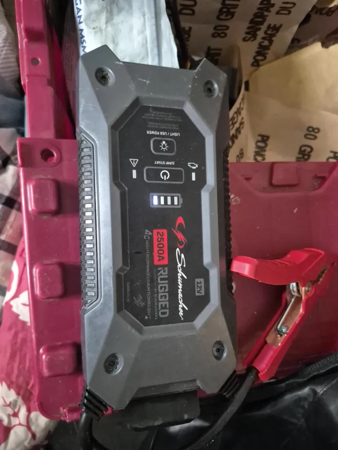 Selling a Schumacher 2500A Rugged jump starter. It features light and USB power, and jump start function. This is a 12V model, with 4C high-performance lithium technology by Schumacher