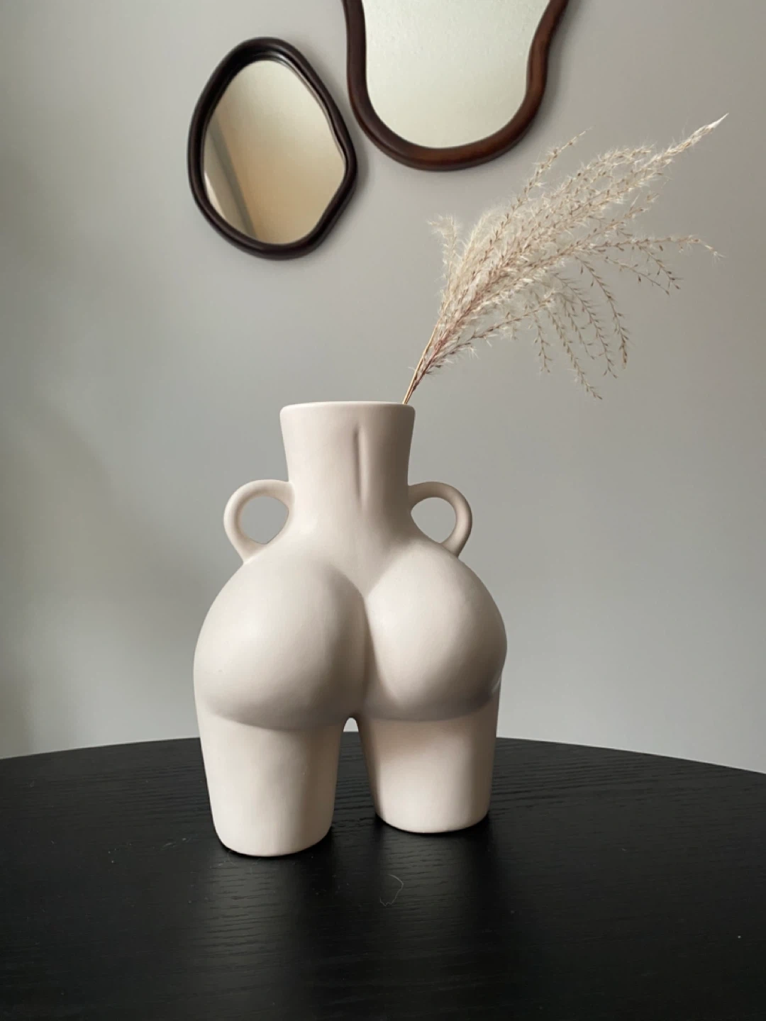 A unique ceramic vase shaped like a human posterior. It's ceramic and finished in a matte cream colour. This piece adds a quirky touch to any room's decor. I styled it in a bathroom!