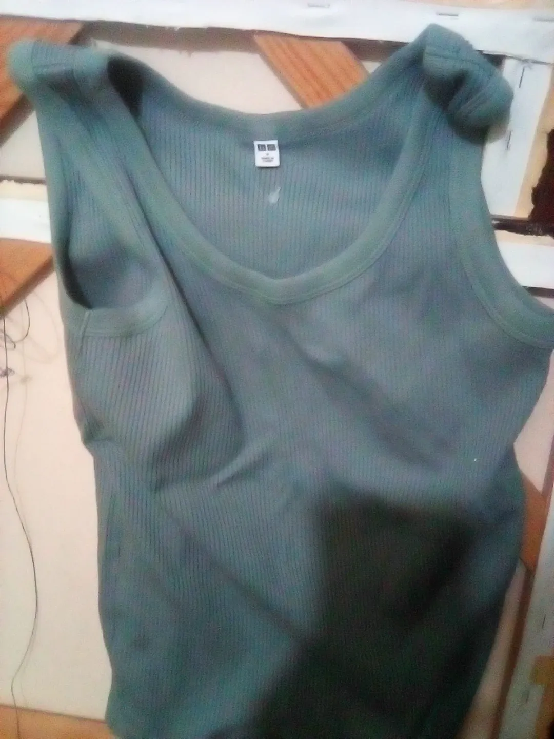 This is a UNIQLO ribbed tank top in a teal color. It's made of a comfortable, stretchy material. This tank is a basic layering piece.