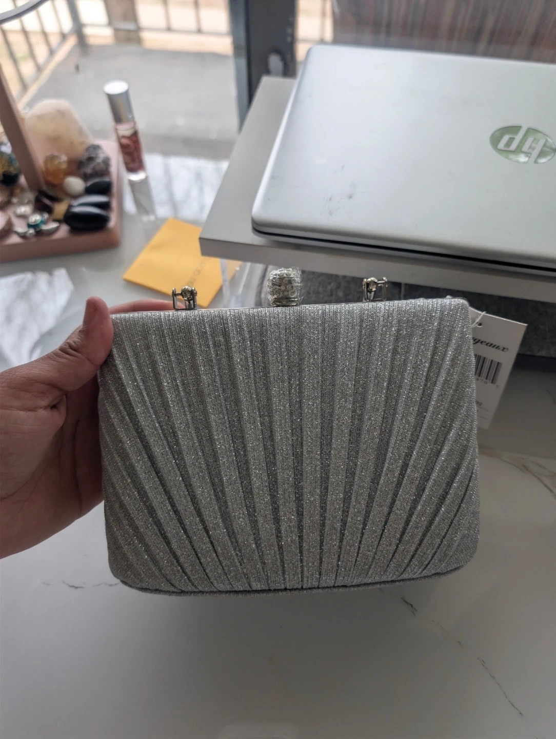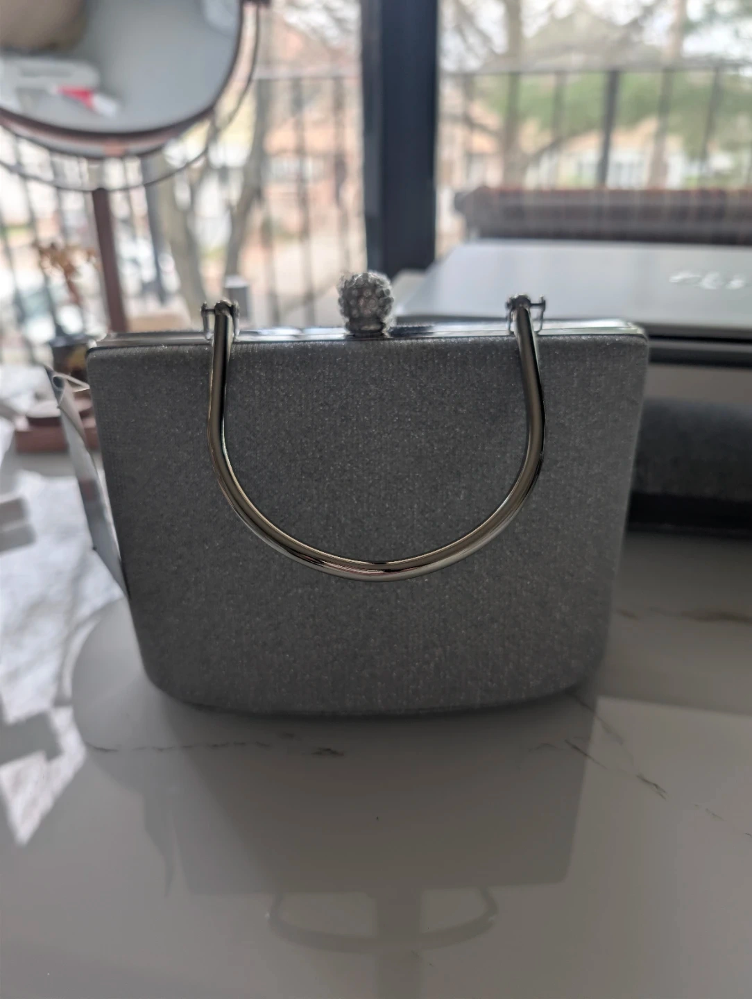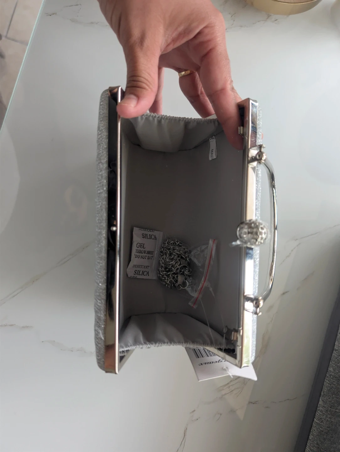 This silver glitter clutch purse is perfect for special occasions. It features a satin-lined interior and a decorative jeweled clasp. Comes with a detachable silver chain strap.