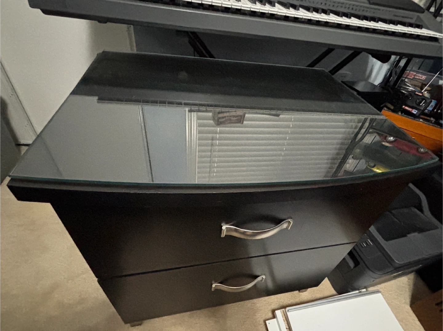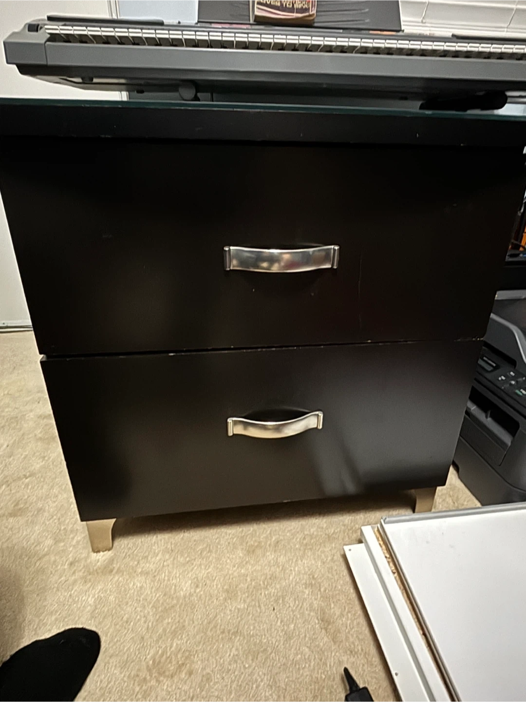Selling a black nightstand with two drawers. It has a glass top and silver-tone handles. It's perfect for adding some storage next to your bed!