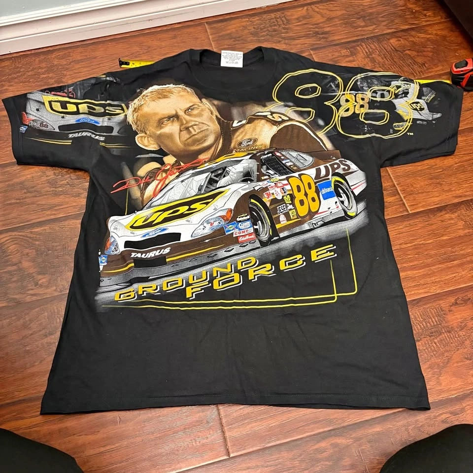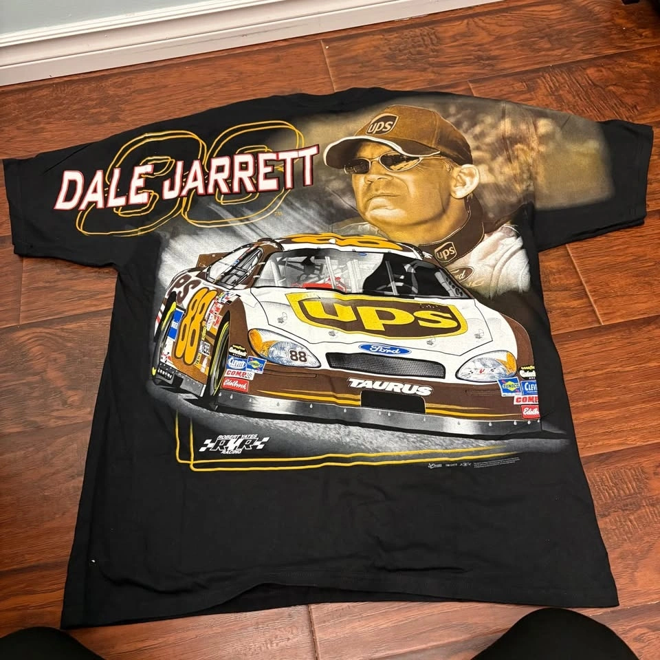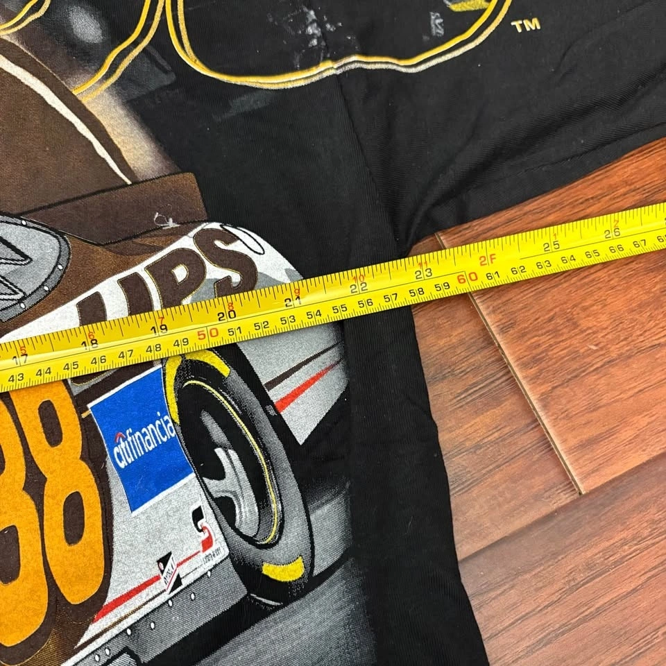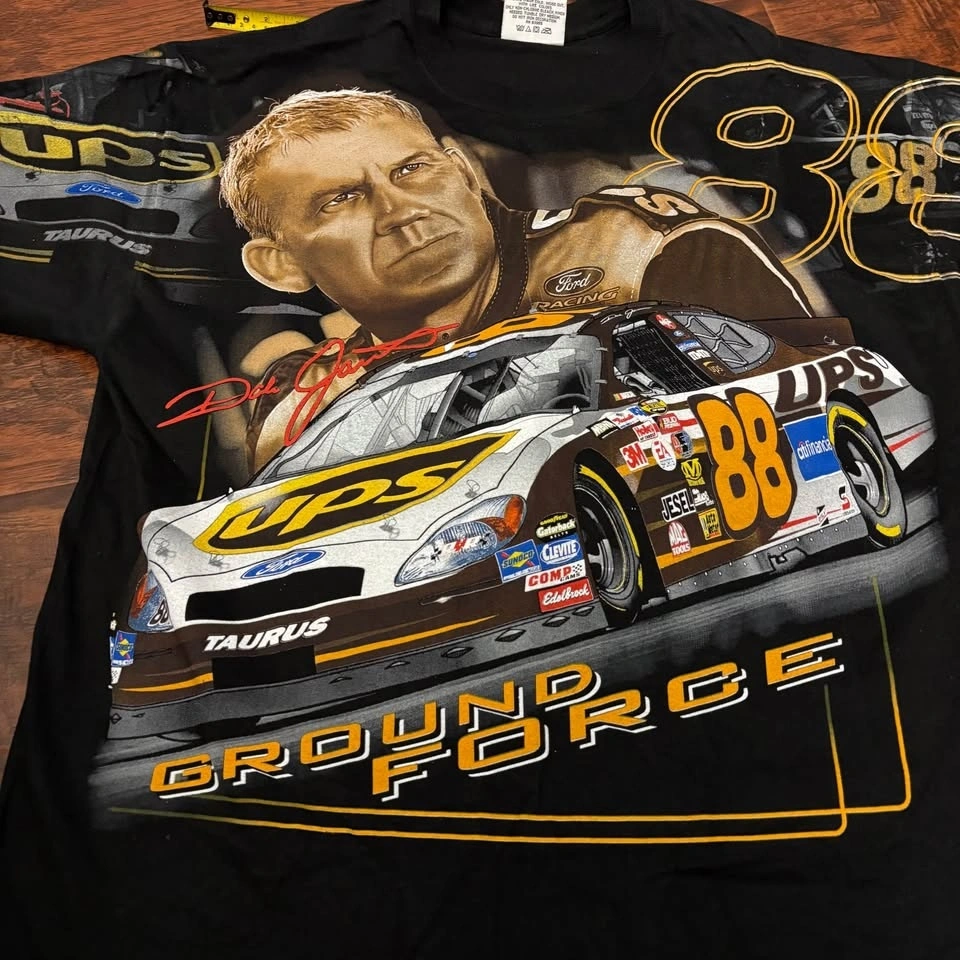 This is a vintage NASCAR Chase Authentics All-Over Print T-shirt featuring Dale Jarrett and his #88 UPS Ford Taurus, likely produced in the late 1990s or early 2000s. Feel free to message if you have any questions!