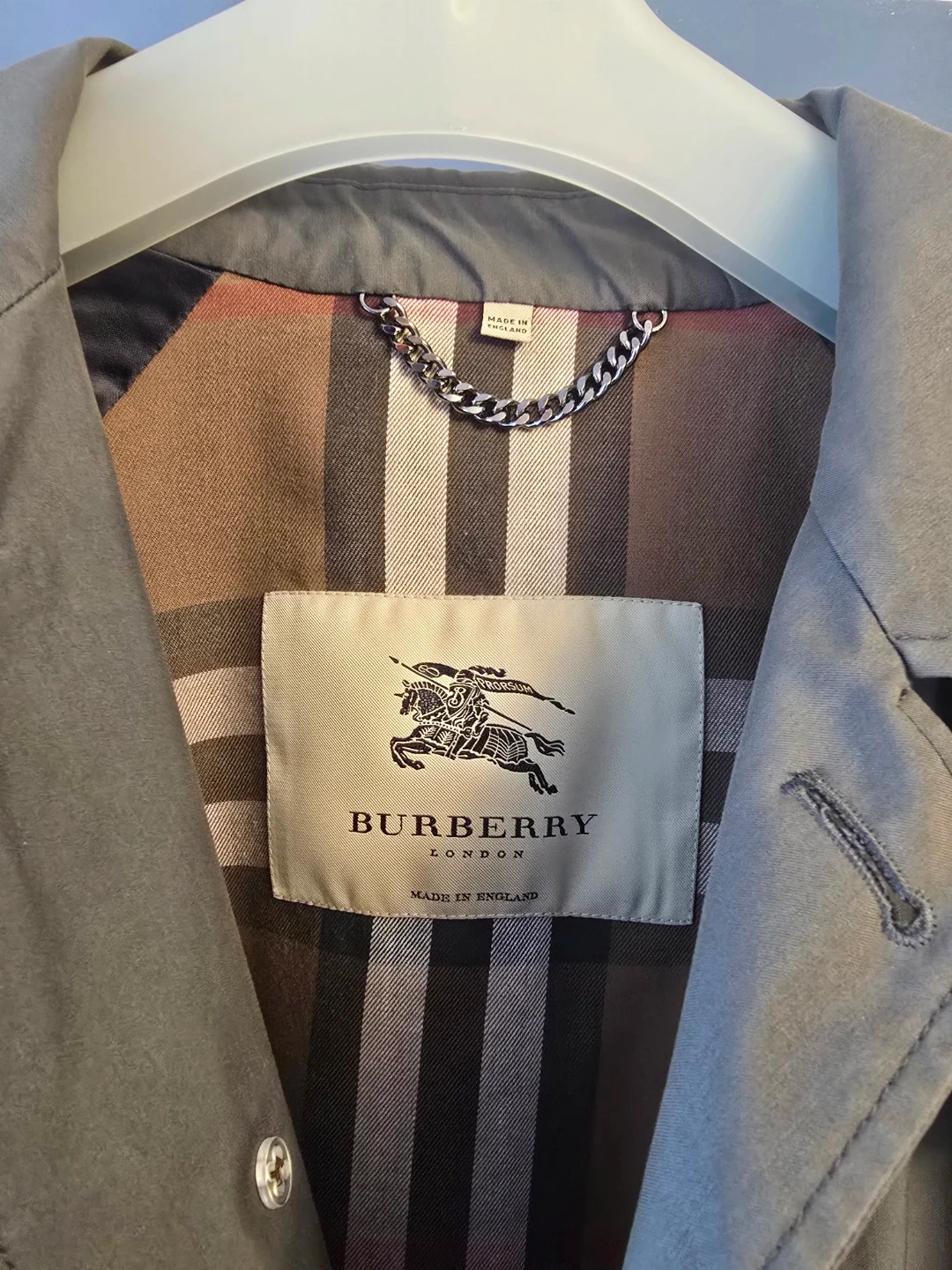 Classic Burberry London men's trench coat in grey. Size 52R, (large) made in England. Features the iconic Nova Check lining. It's a stylish outerwear piece for any wardrobe.