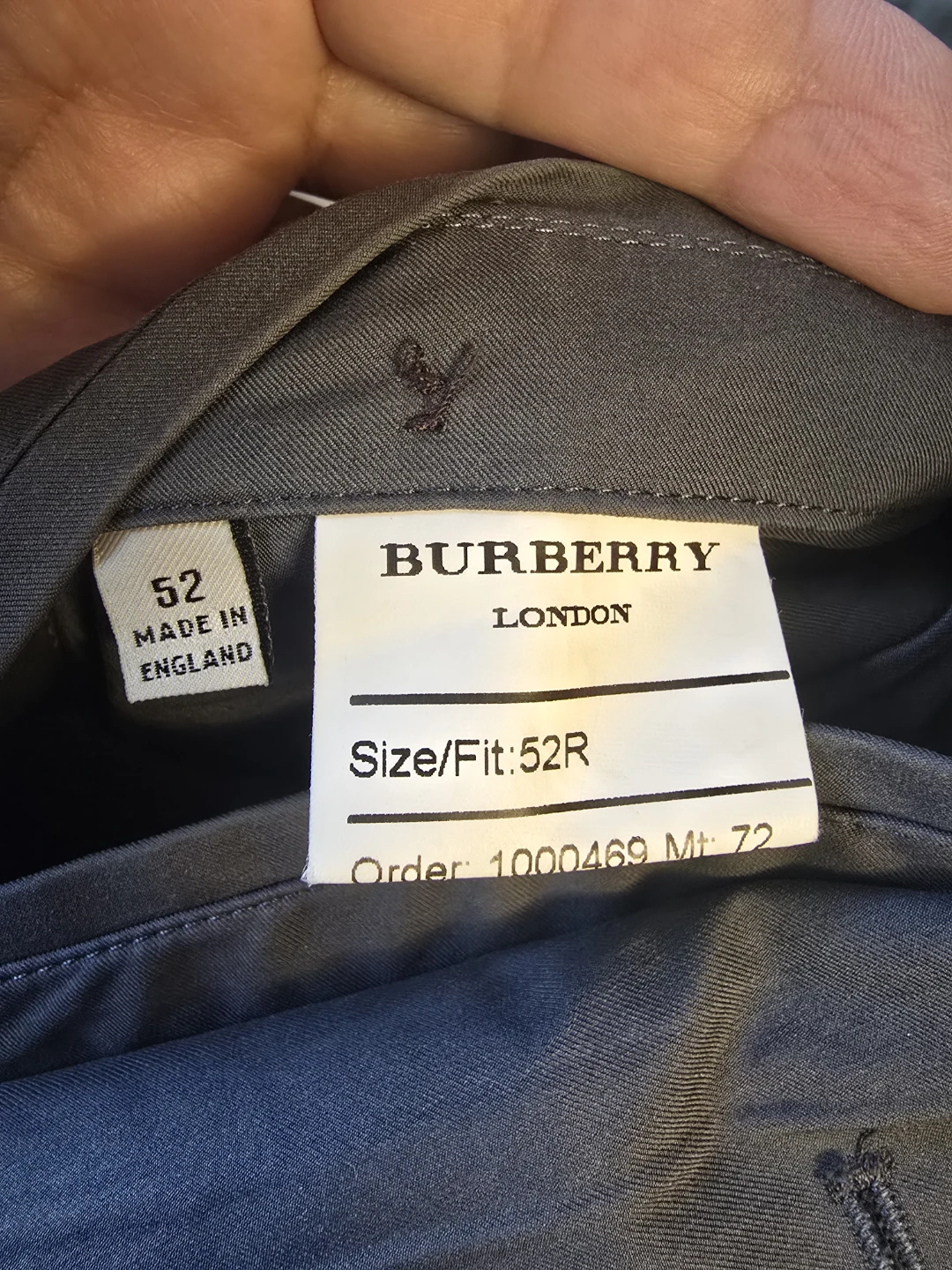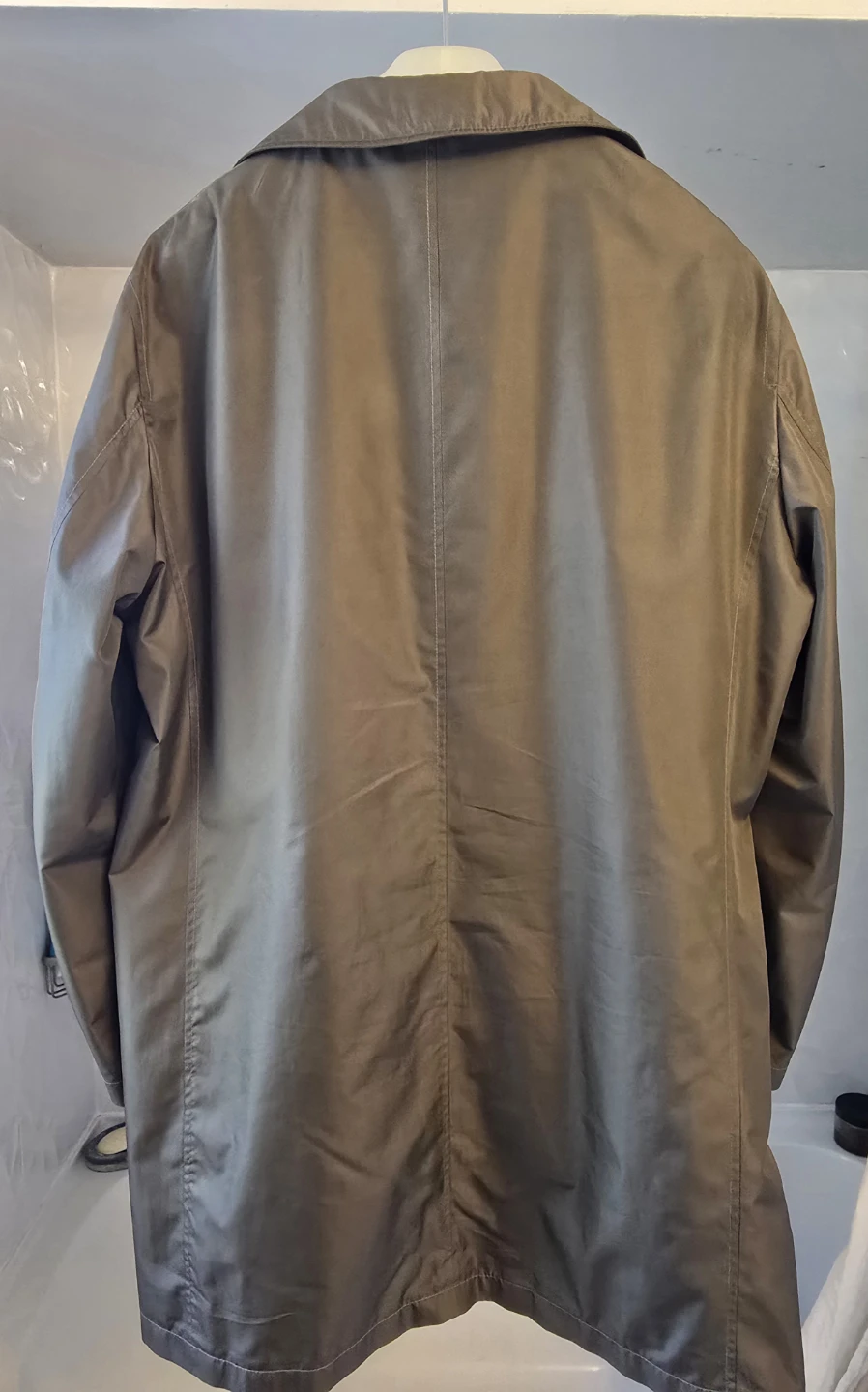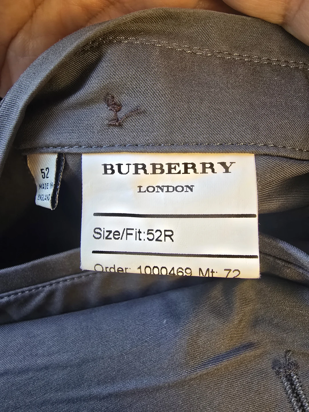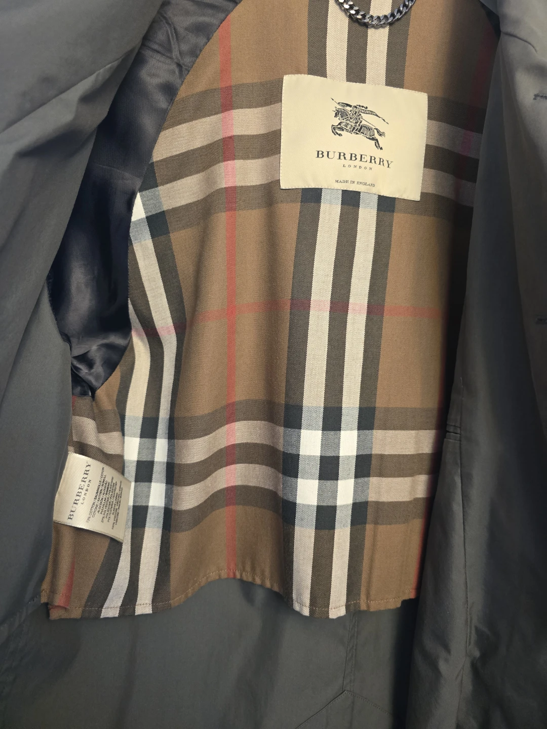 Classic Burberry London men's trench coat in grey. Size 52R, (large) made in England. Features the iconic Nova Check lining. It's a stylish outerwear piece for any wardrobe.