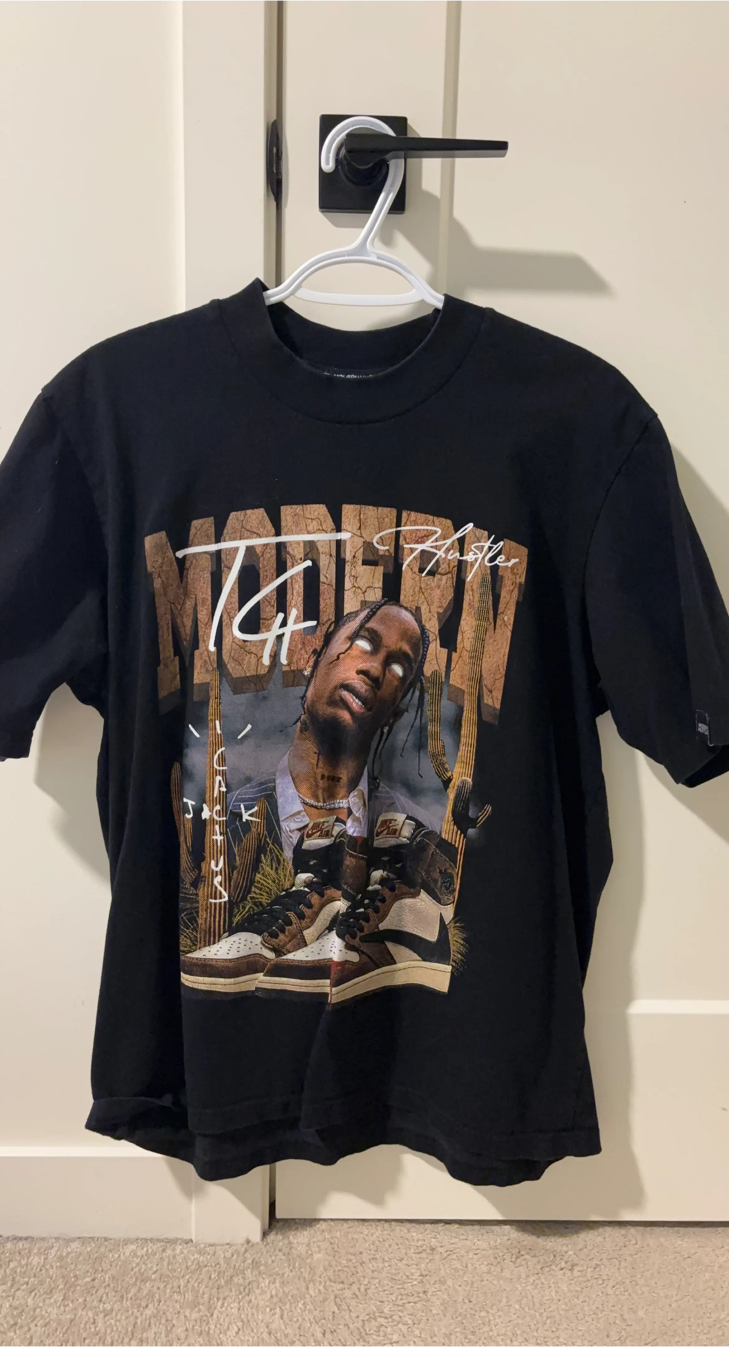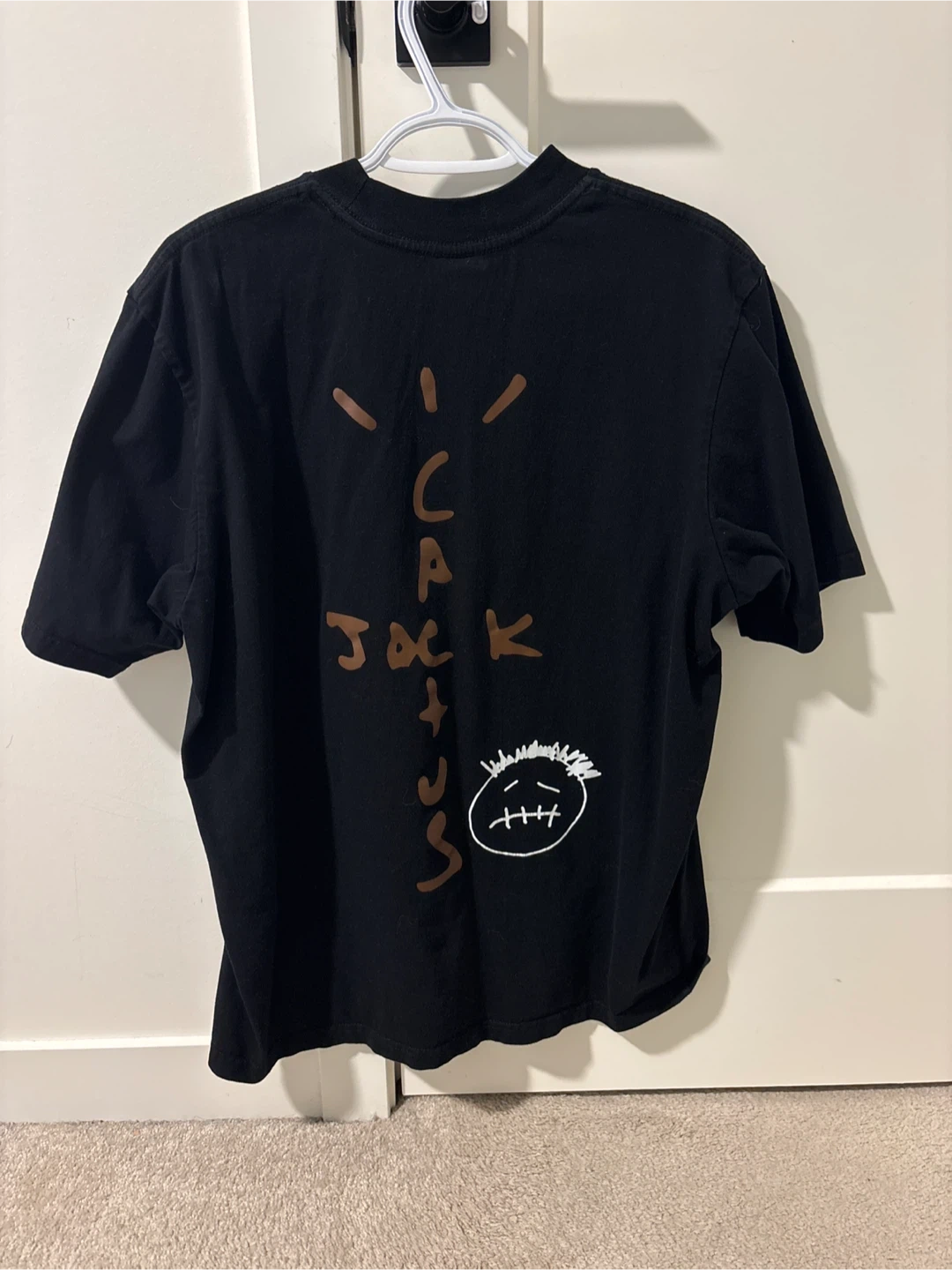 Black t-shirt featuring Travis Scott and cactus graphics. The front has a "Modern" text design and "JackBoys" graphic. The back has the "Cactus Jack" logo and a stylized face. Cotton material.