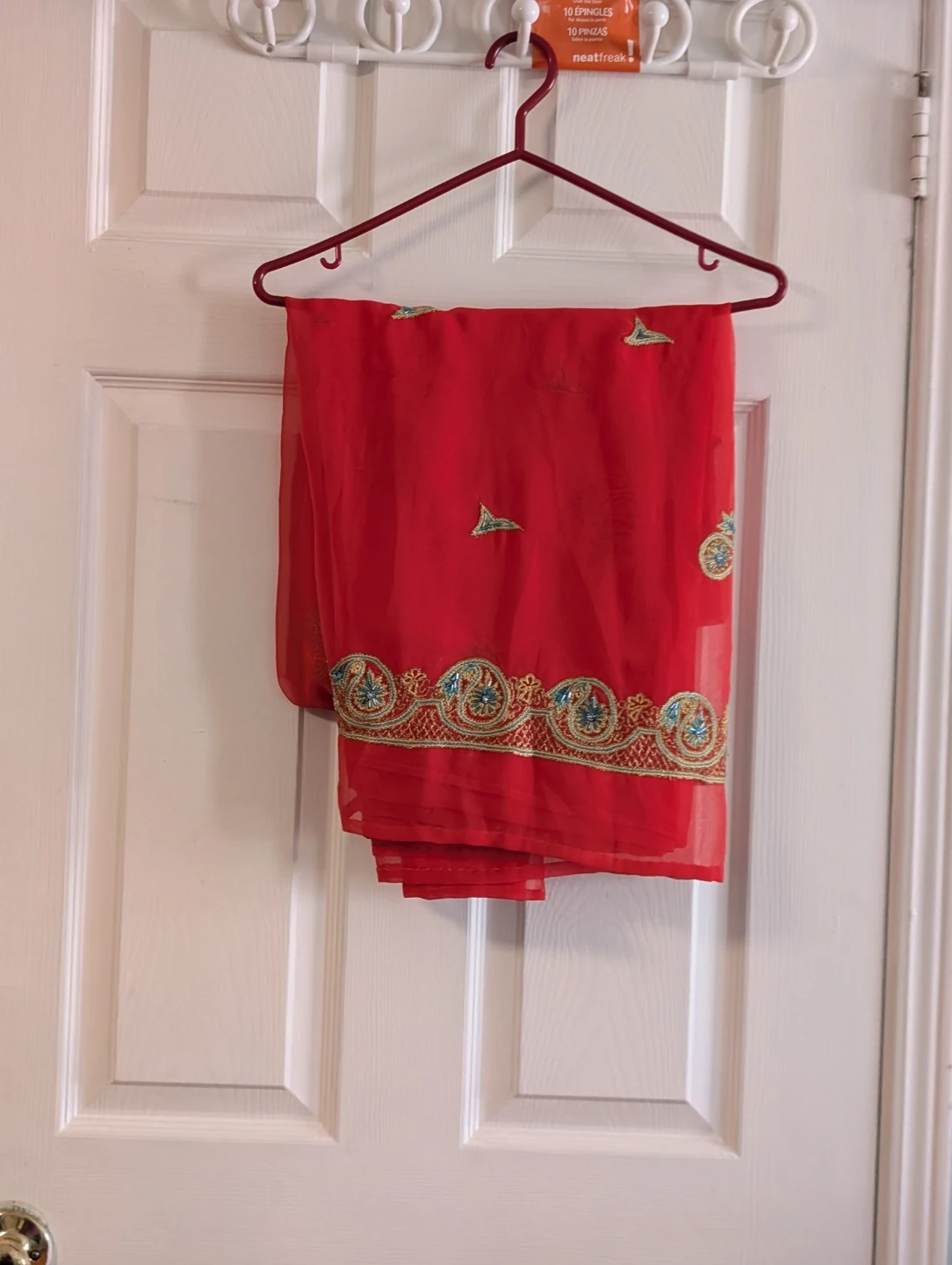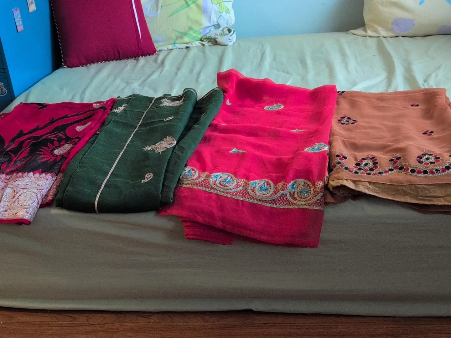 This is a lot of four embroidered sarees in various colours including pink, green, red, and orange. They are all made of sheer fabric with decorative embroidery. Great for special occasions!