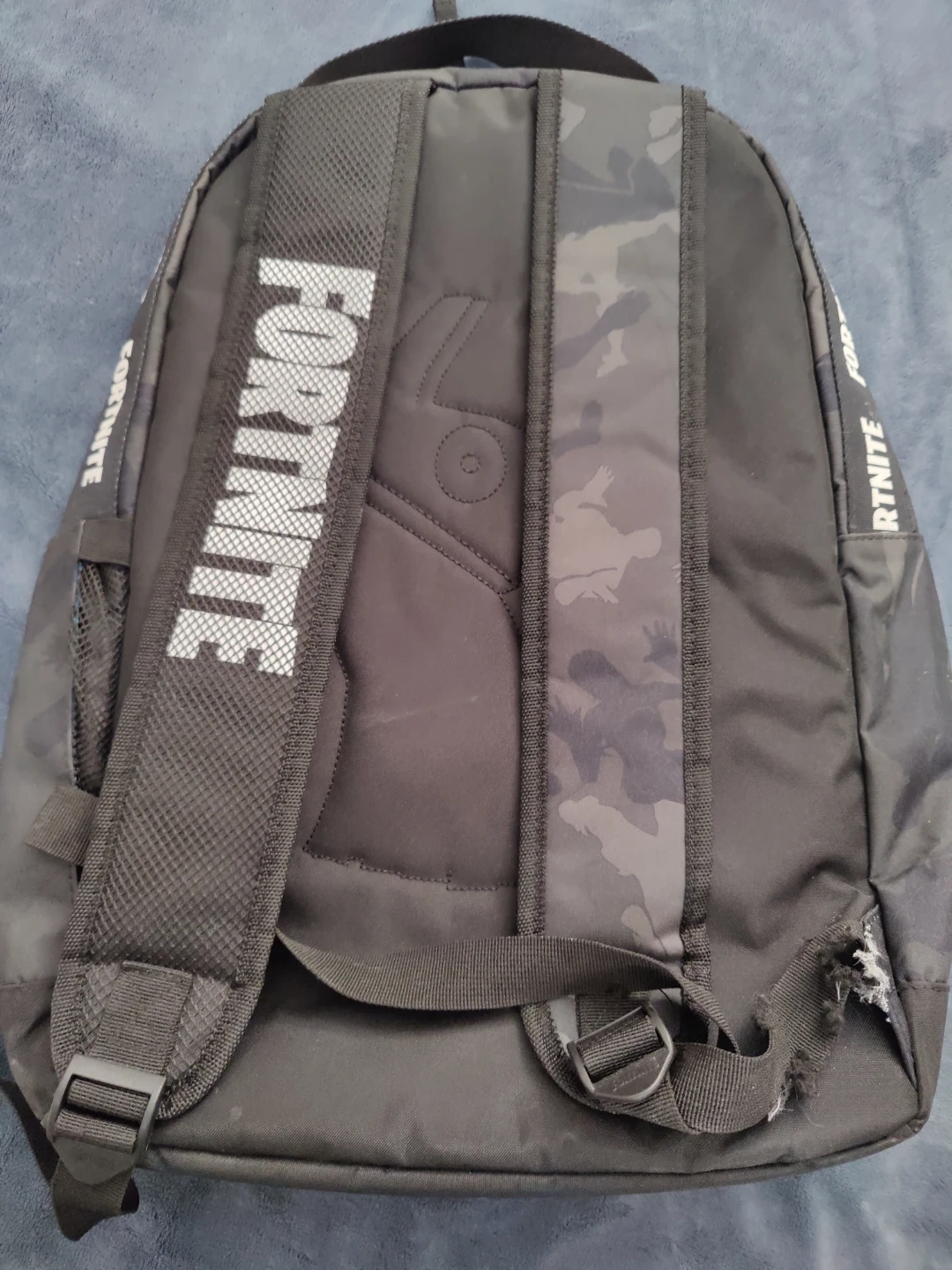 Selling a Fortnite backpack with a cool camo pattern! It has a front pocket with a white zipper and the Fortnite logo on the front. The back straps also have the Fortnite logo. Good for school or everyday use