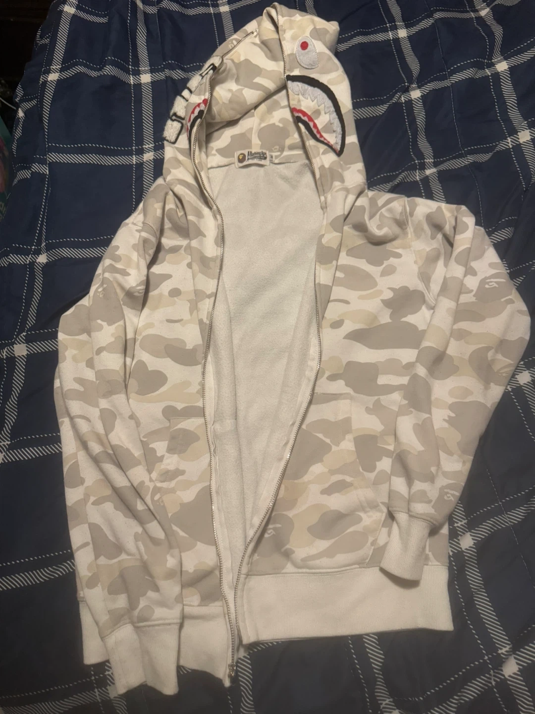 A Bathing Ape full zip hoodie in a light camouflage pattern. Zipup is broken.