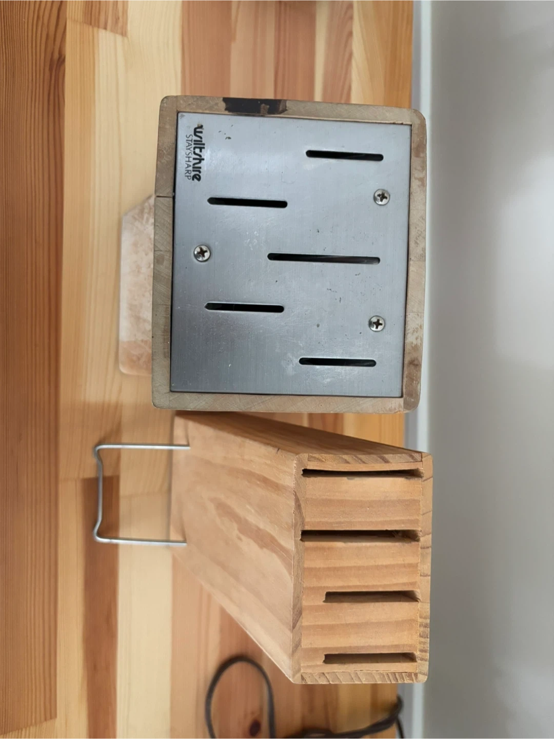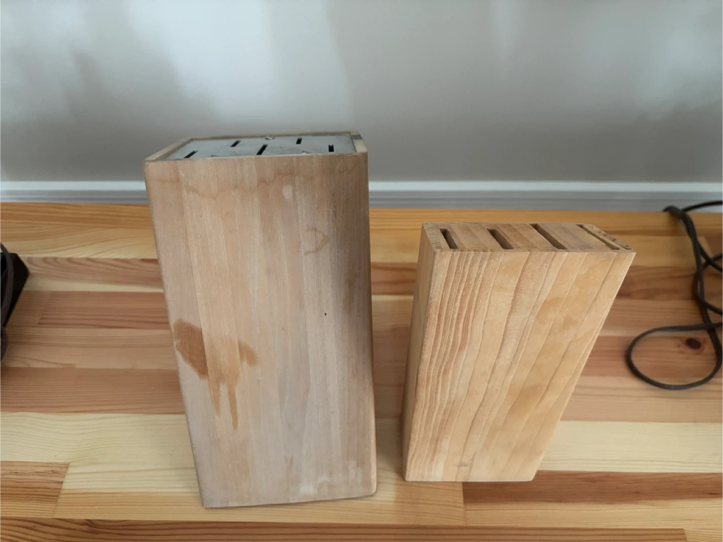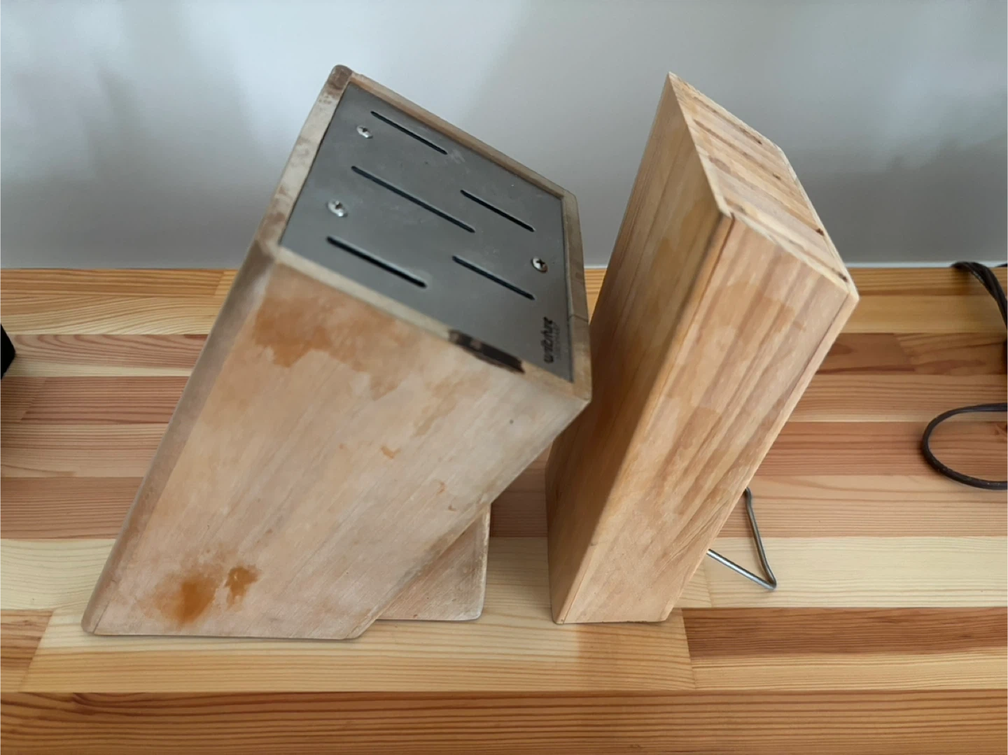 Includes two wooden knife blocks for storing your kitchen knives. One block holds multiple knives and has a metal insert with slots. The other is a solid wood block with horizontal slots. Both are made of light-coloured wood.