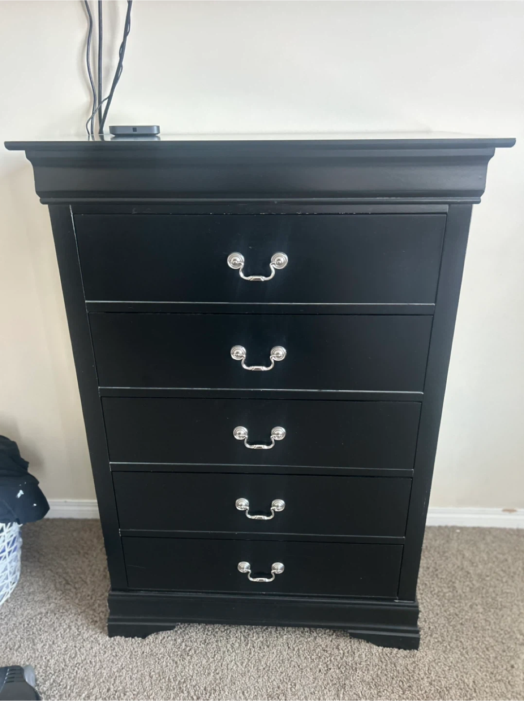 A black dresser with five drawers for storage. It features a sleek design with silver handles. Perfect for organizing clothes and accessories in your bedroom.