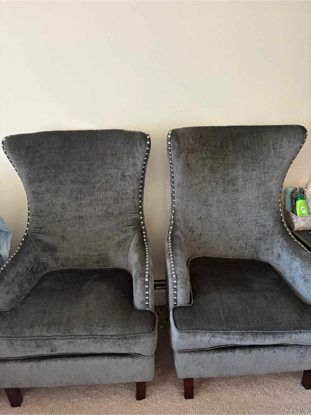 Selling a set of two wingback chairs. They're a lovely dark grey colour and would be perfect for a living room or reading nook. They have a sophisticated look with nailhead trim. They are in good condition and ready for a new home