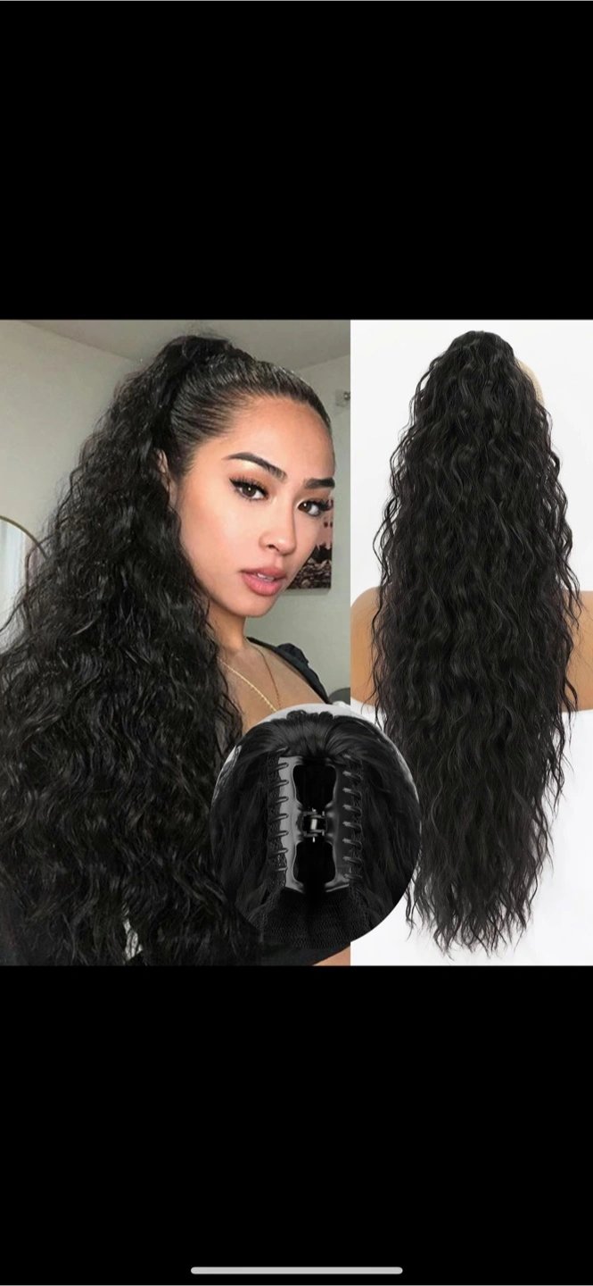 A long wavy ponytail extension. Dark color, with a claw clip for easy application. This would be perfect for a relaxing night out.