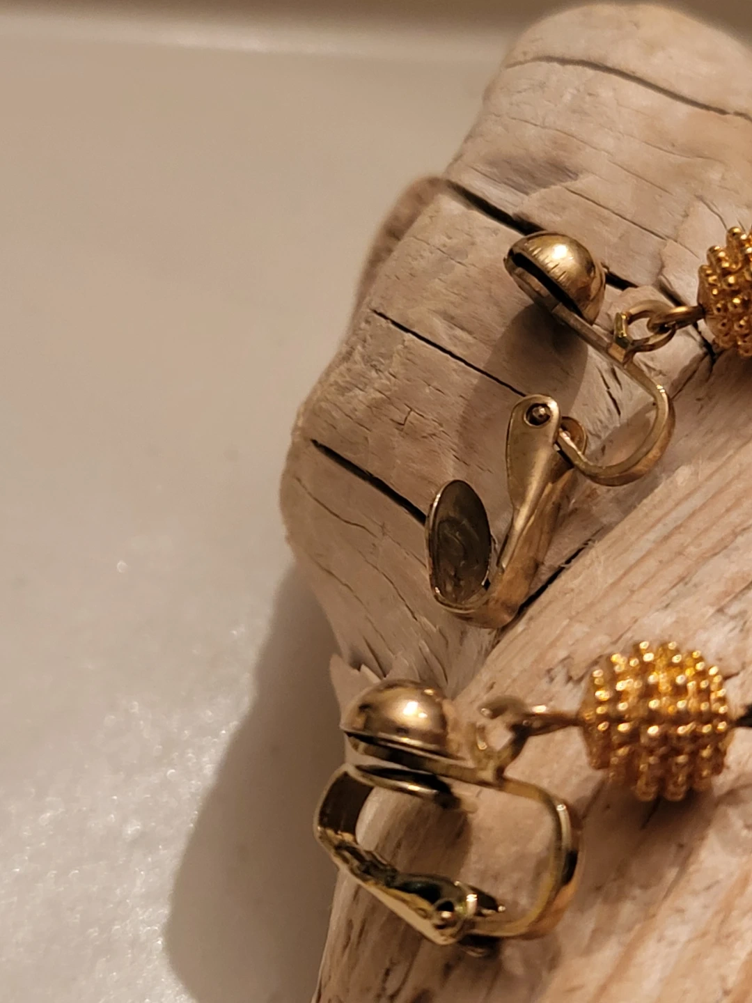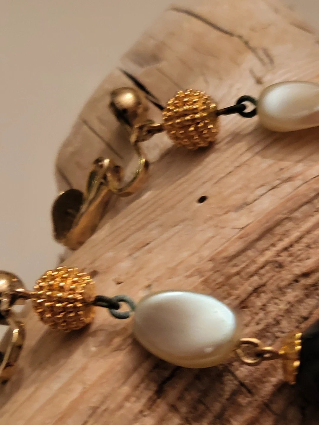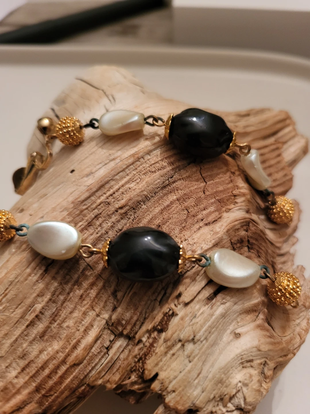 This vintage set of clip on earrings features a mix of shiny black beads and pearlescent white beads, accented with textured gold-tone spheres. The jewellery has a classic, elegant design.