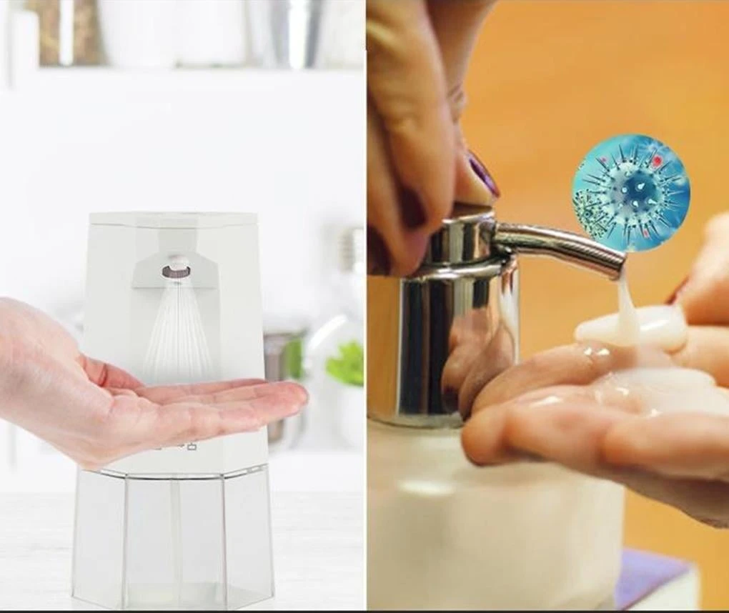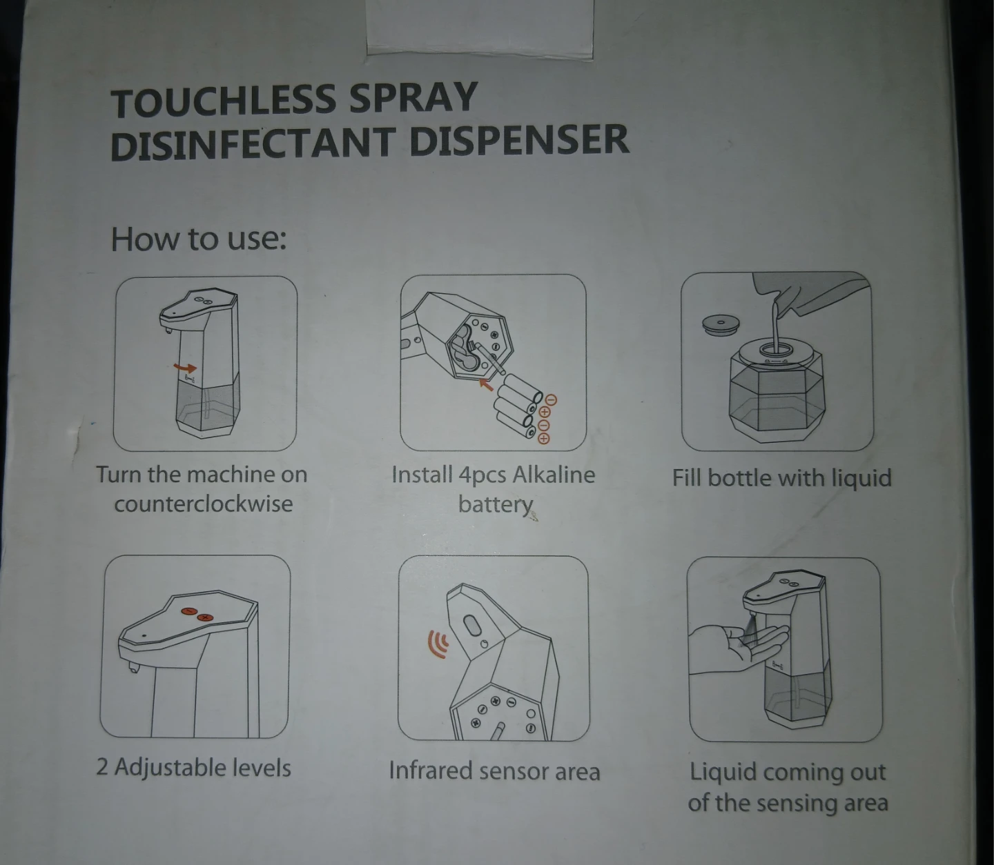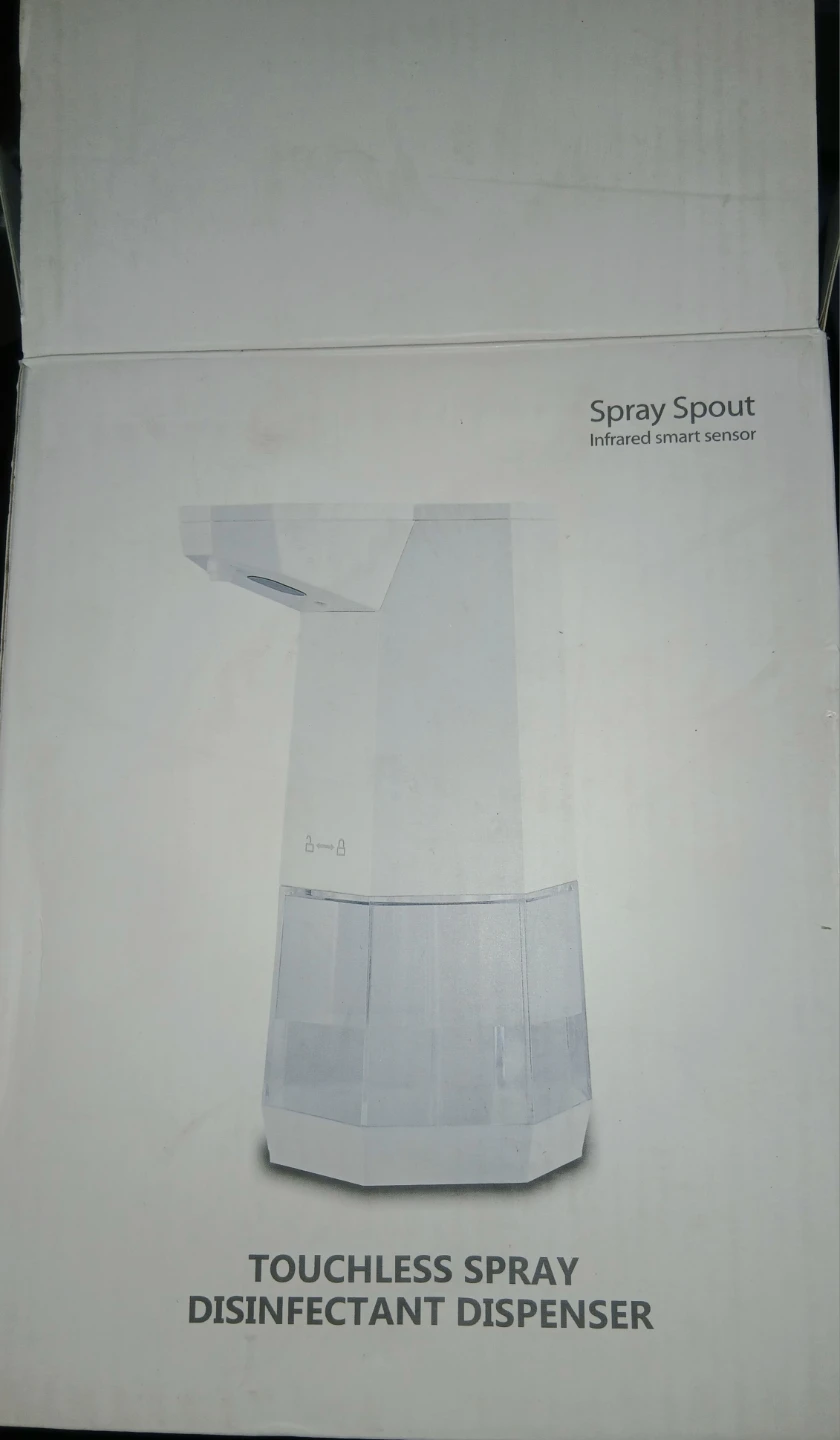 Infrared smart sensor touchless spray disinfectant dispenser. Uses 4 AA alkaline batteries.
