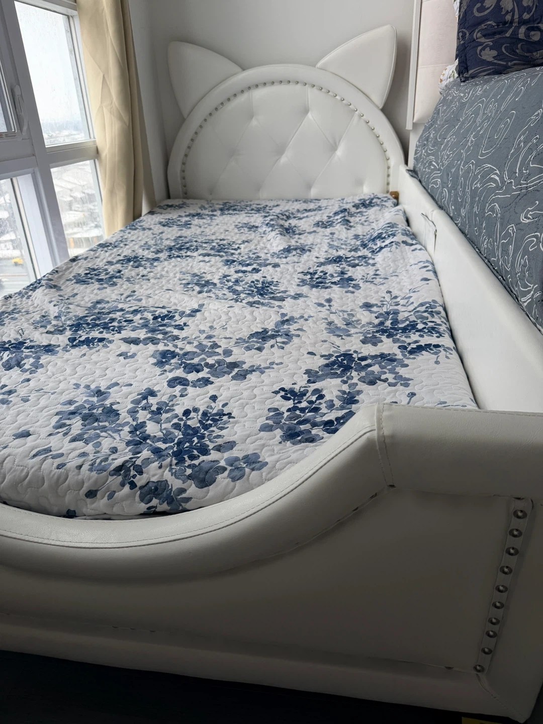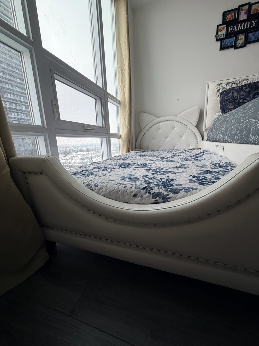 Selling a cute white bed frame with cat ears! The bed frame is in good condition and would look great in a kid's room or for anyone who loves cats. The bed features a unique headboard with cat ear detailing, adding a whimsical touch to any bedroom decor