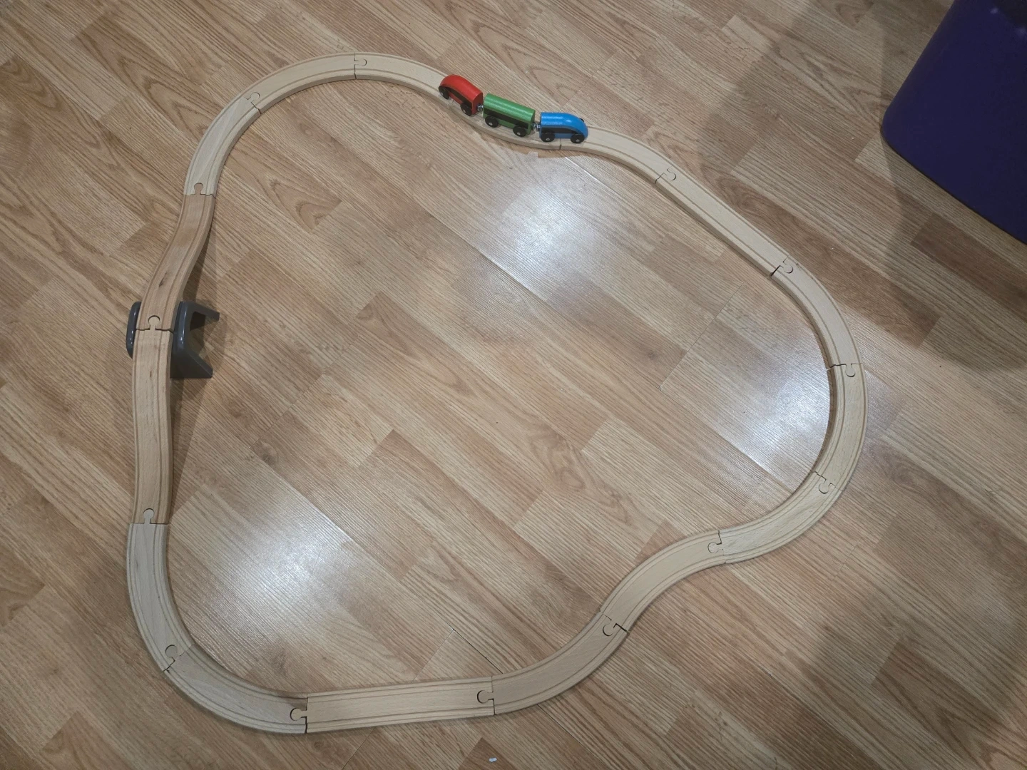This set includes a variety of wooden train tracks and three colourful cars. It's perfect for building imaginative railway layouts.