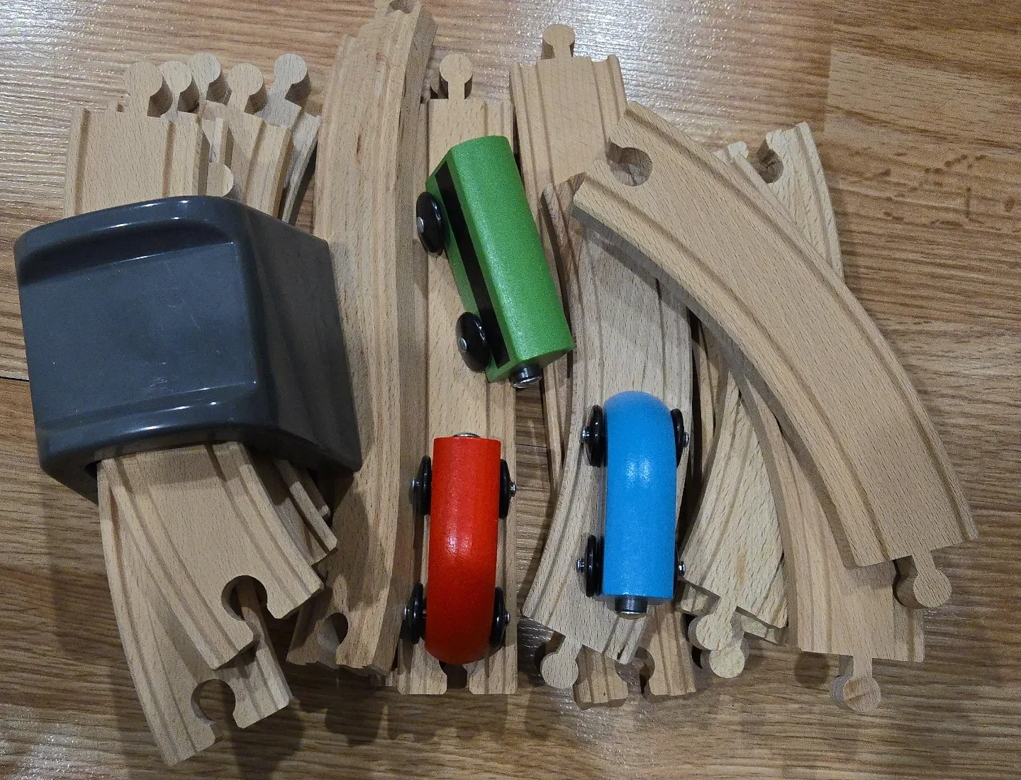 This set includes a variety of wooden train tracks and three colourful cars. It's perfect for building imaginative railway layouts.