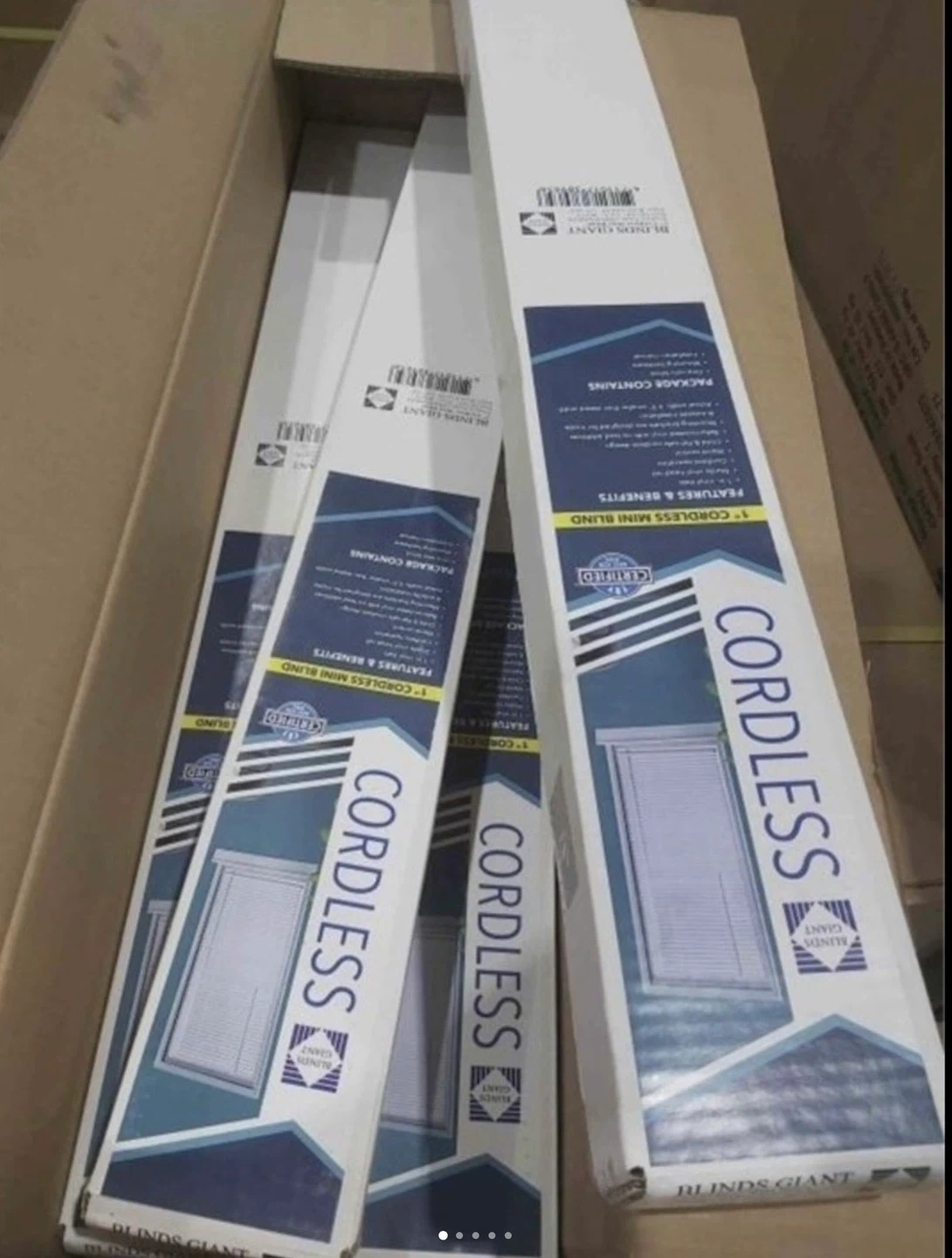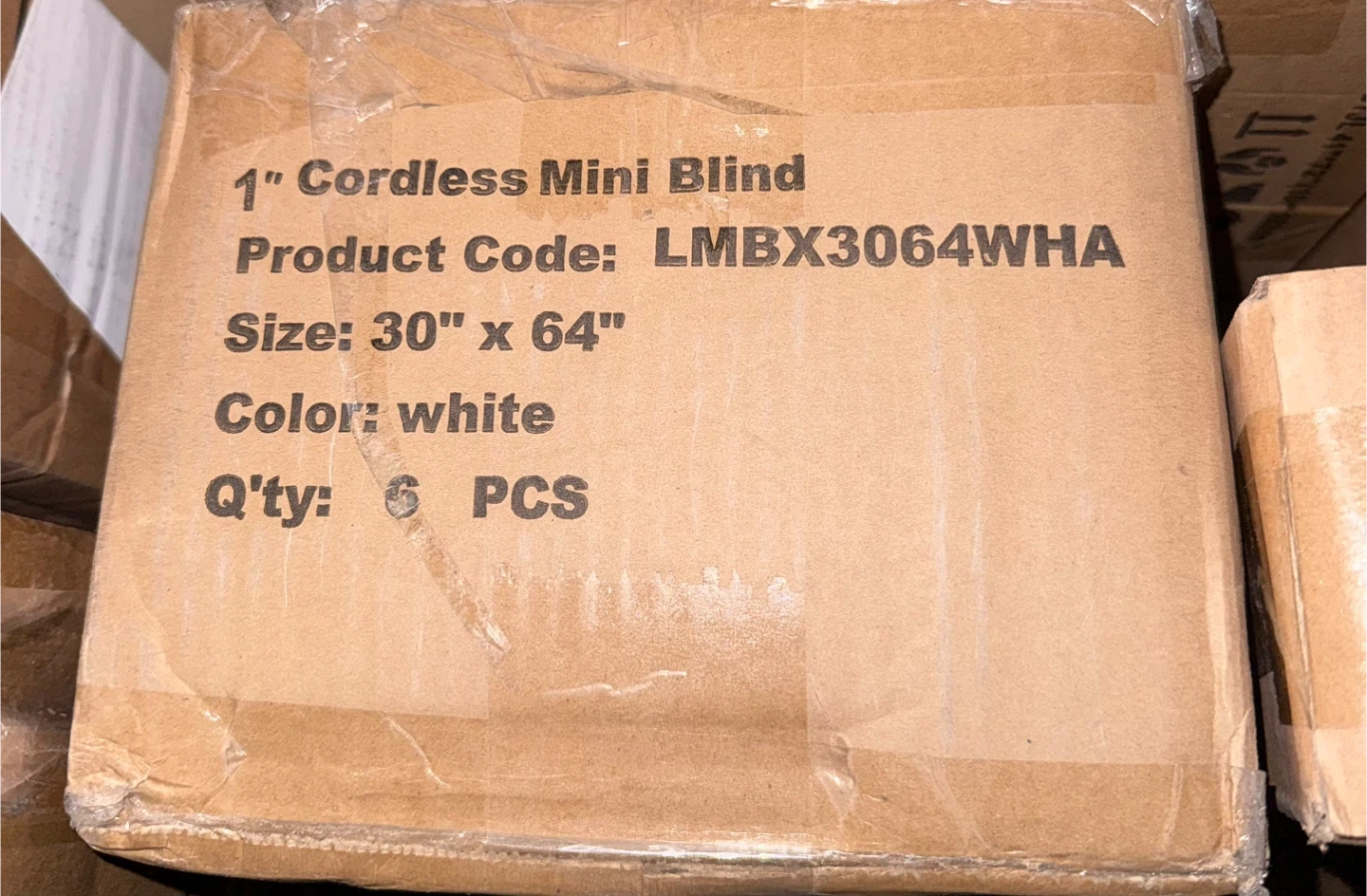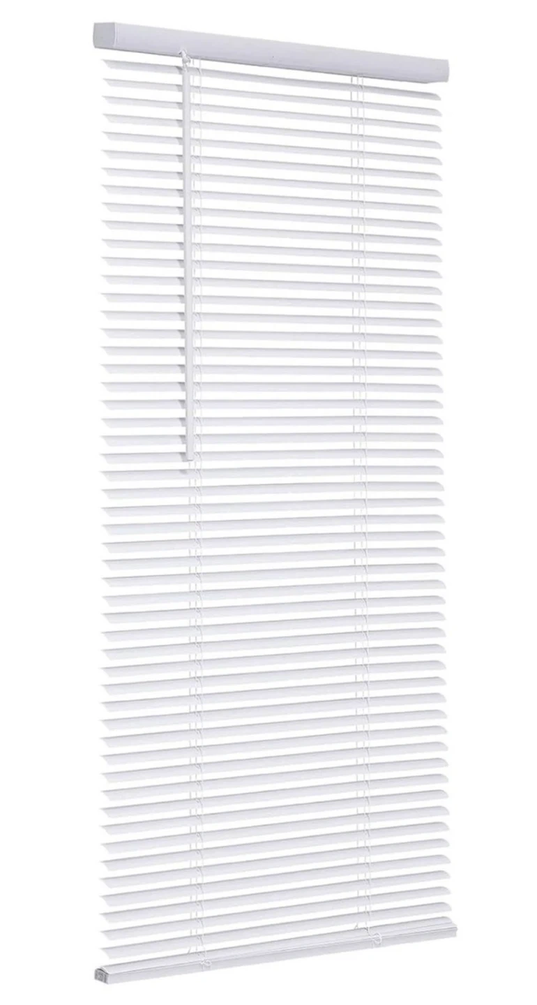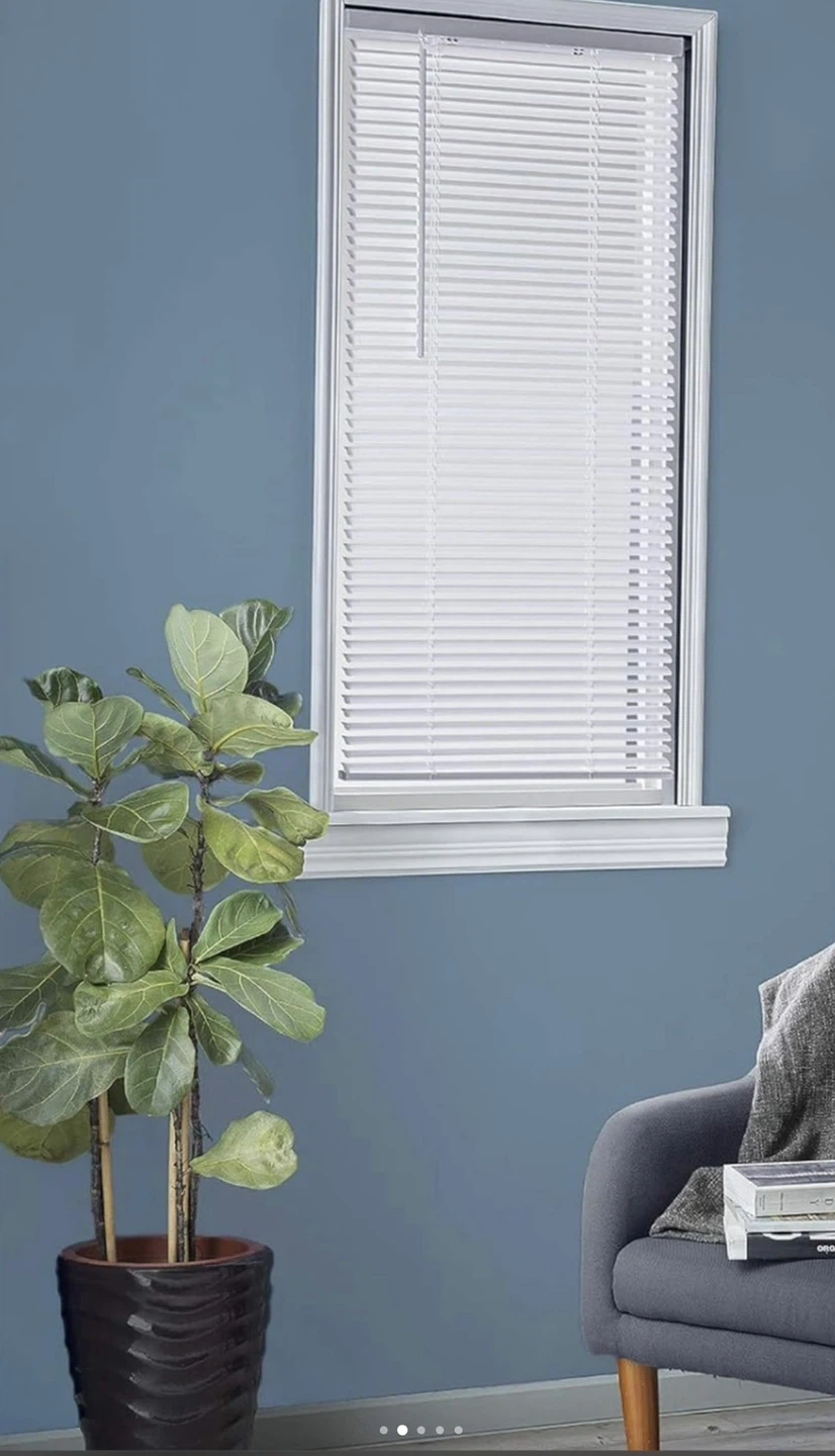White 1" cordless mini blind. Size is 30 inches by 64 inches. Includes original box. This blind is useful for light control and privacy in any room.