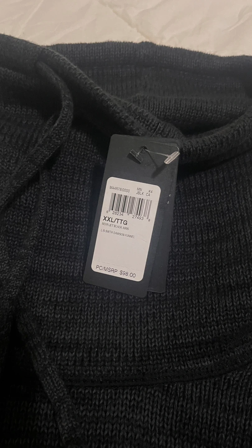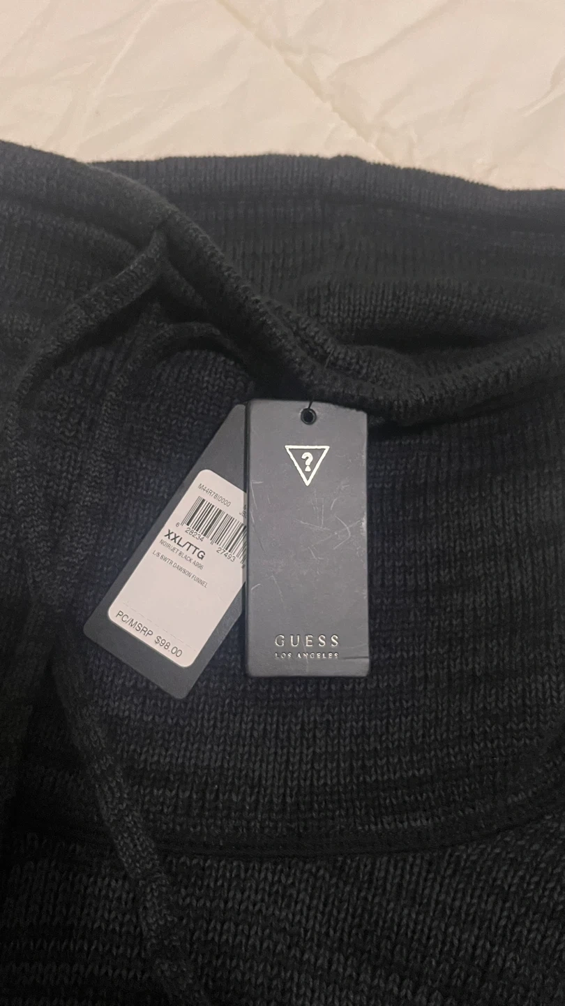 Guess men's knit sweater in charcoal colour. It's a size XX-Large/TTG. The material is a blend of cotton and acrylic. Turtle neck style with drawstring.