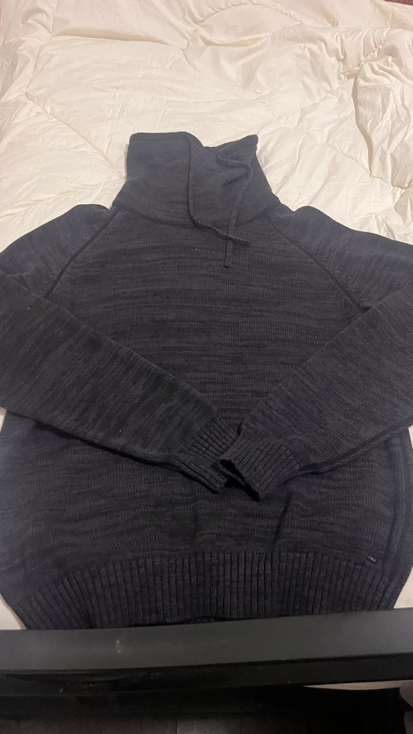 Guess men's knit sweater in charcoal colour. It's a size XX-Large/TTG. The material is a blend of cotton and acrylic. Turtle neck style with drawstring.