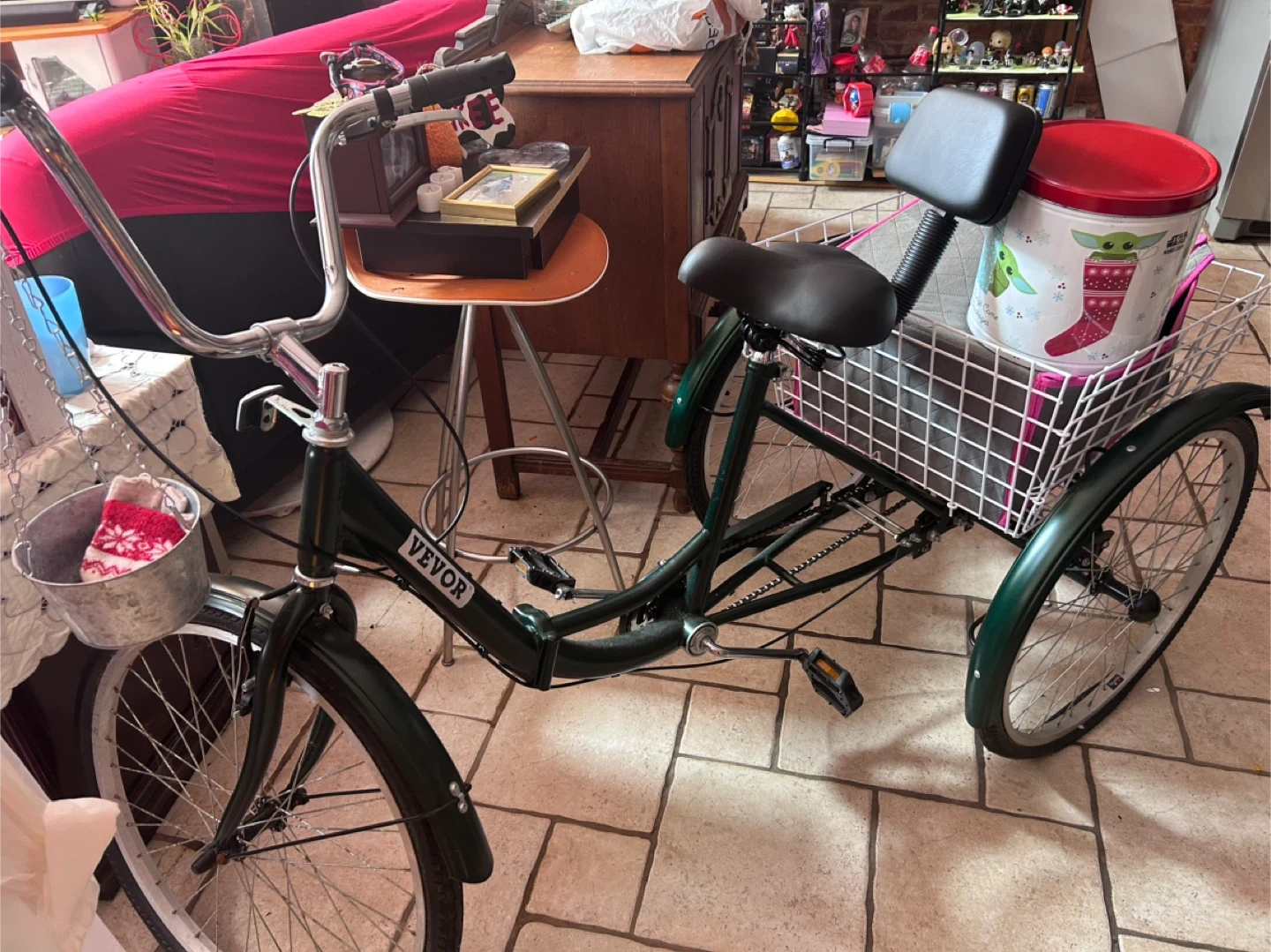 VEVOR adult tricycle with a large rear basket for storage. This three-wheeled bike offers stability and convenience for riding. It's green and has a comfortable seat. Great for errands or leisurely rides!(NOTE: the bike has flat tires!)