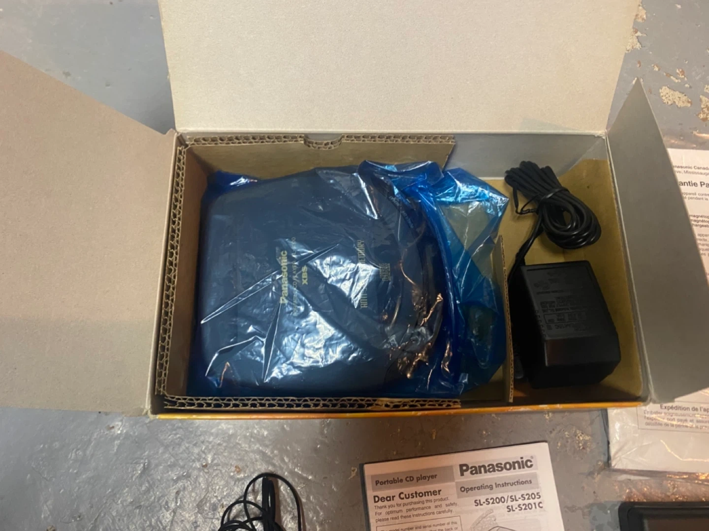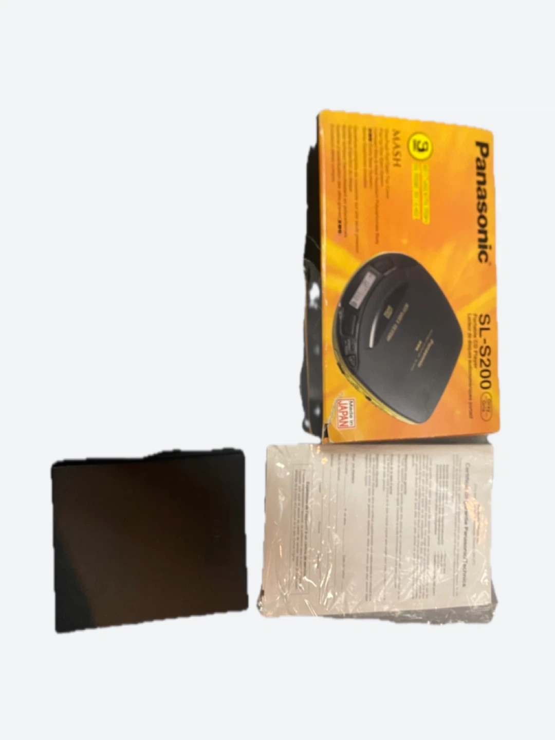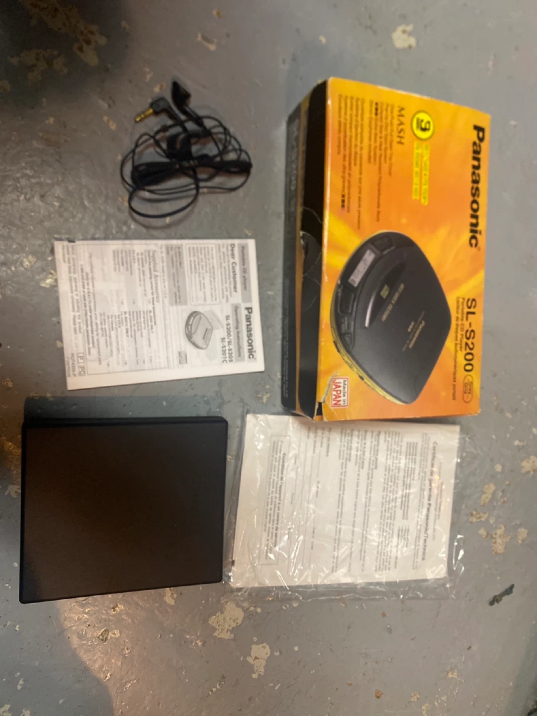 This new Vintage Panasonic SL-S200 portable CD player comes with its original box and operating instructions. It features 3-second anti-shock memory and MASH technology. Stereo earphones are also included.