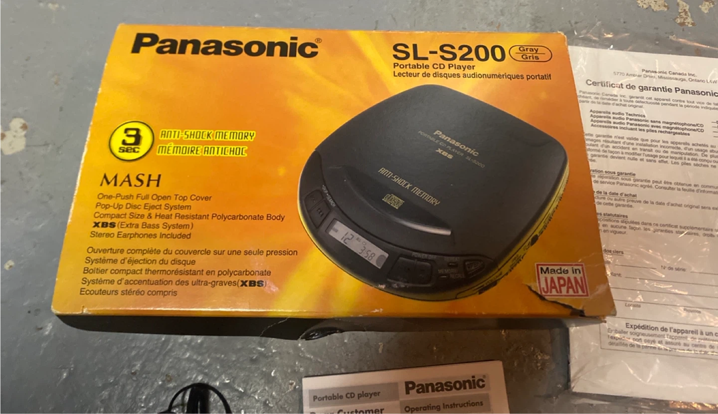 This new Vintage Panasonic SL-S200 portable CD player comes with its original box and operating instructions. It features 3-second anti-shock memory and MASH technology. Stereo earphones are also included.