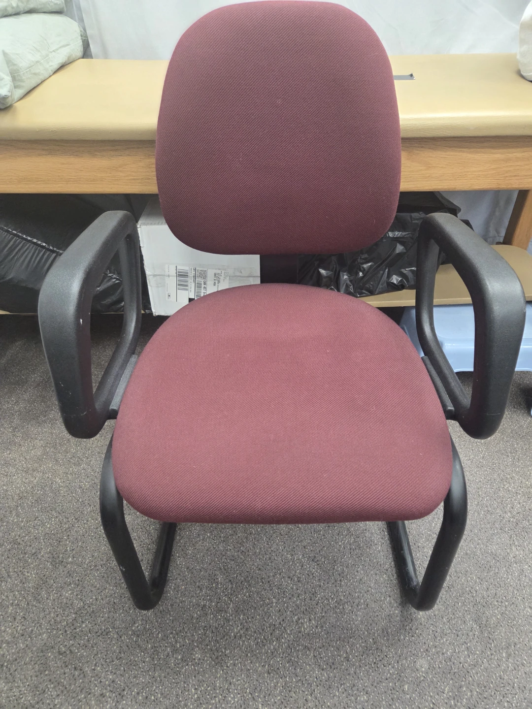 Selling a burgundy office chair with black armrests and a sturdy frame. It's in good condition and ready to use in your home office or workspace. The fabric is a nice, durable material. we have 5 of them.