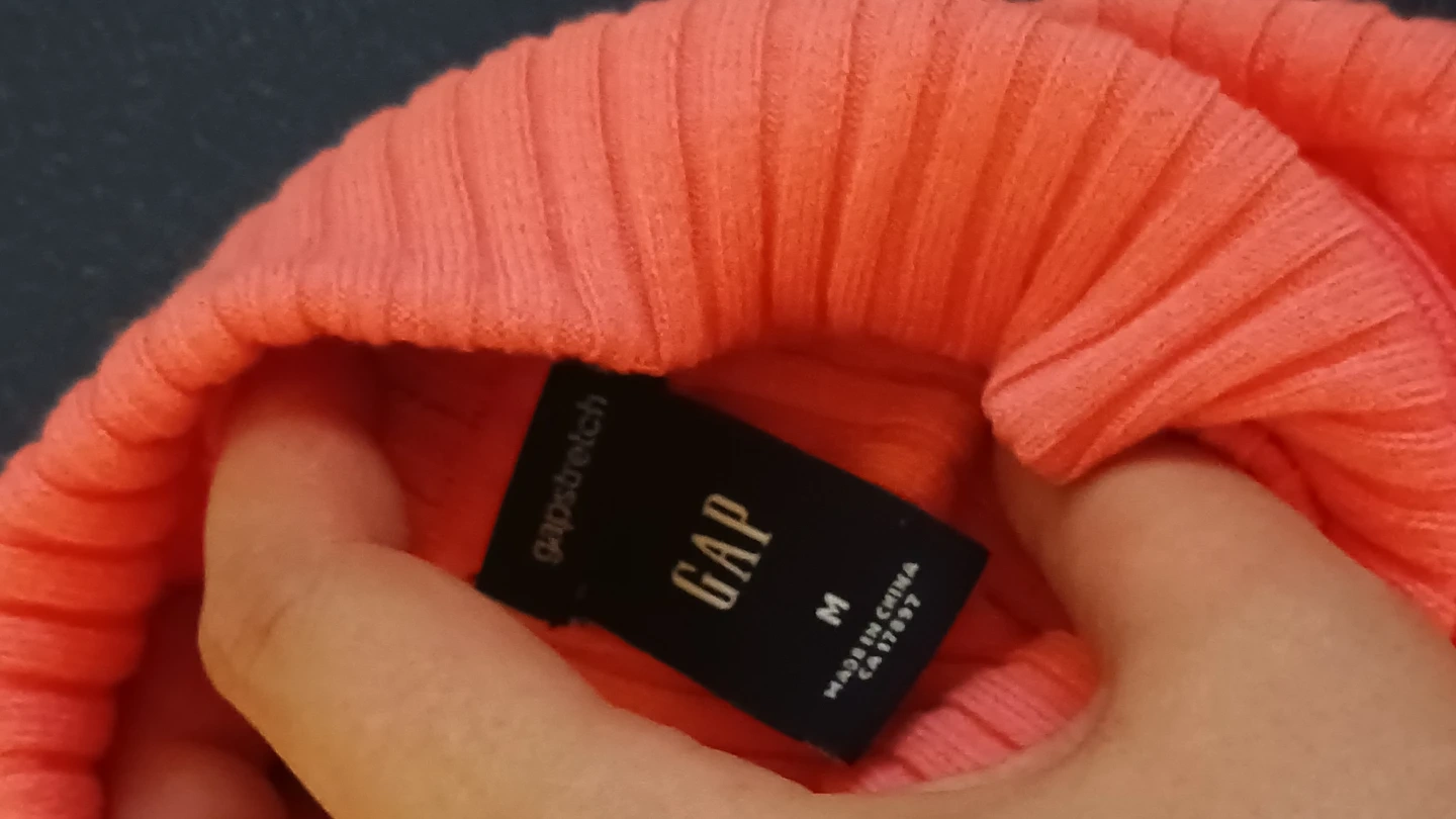 A coral ribbed turtleneck sweater from GAP. It's a size medium. Material is soft and stretchy, perfect for cooler weather! Never worn!