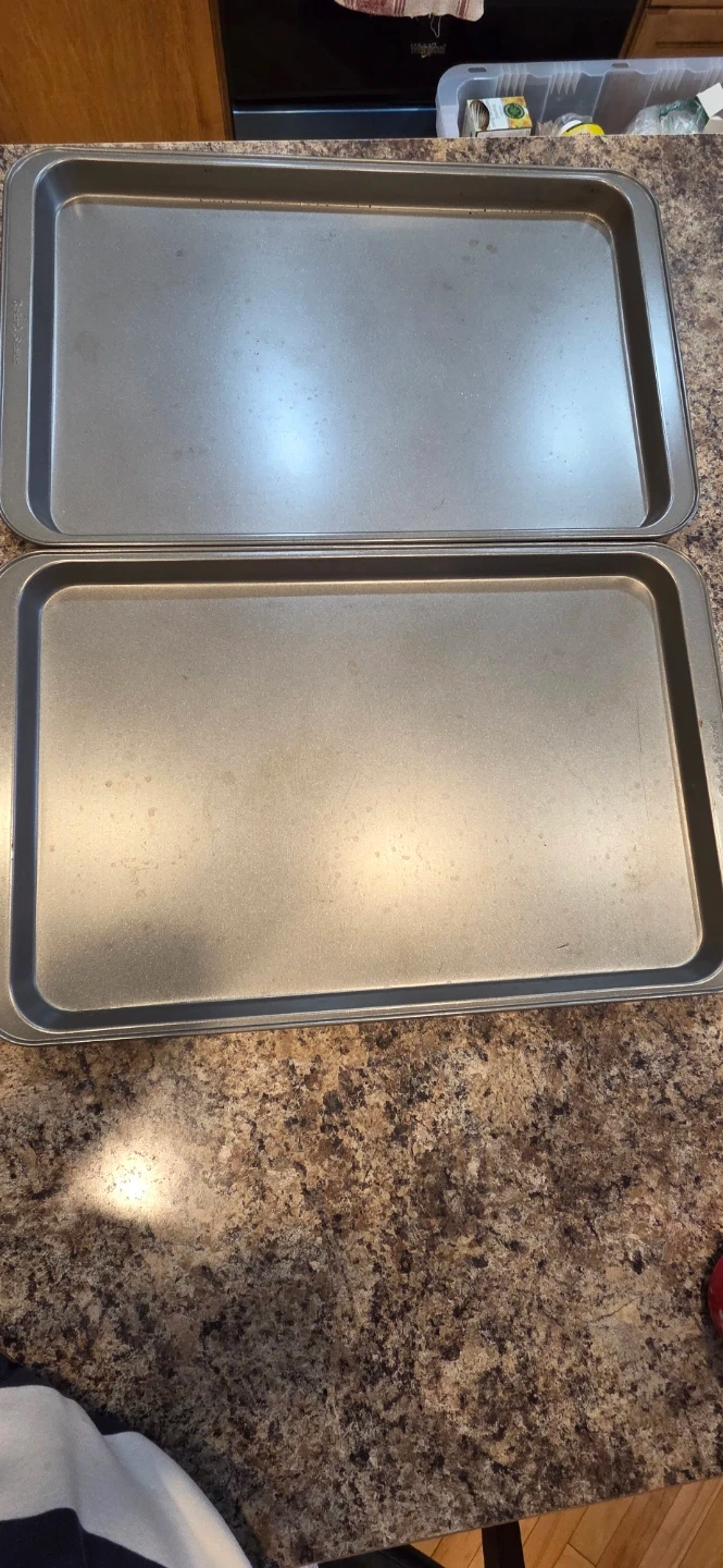 This is a set of two Baker's Secret baking sheets. They are made of metal. This is useful for baking cookies and other treats.