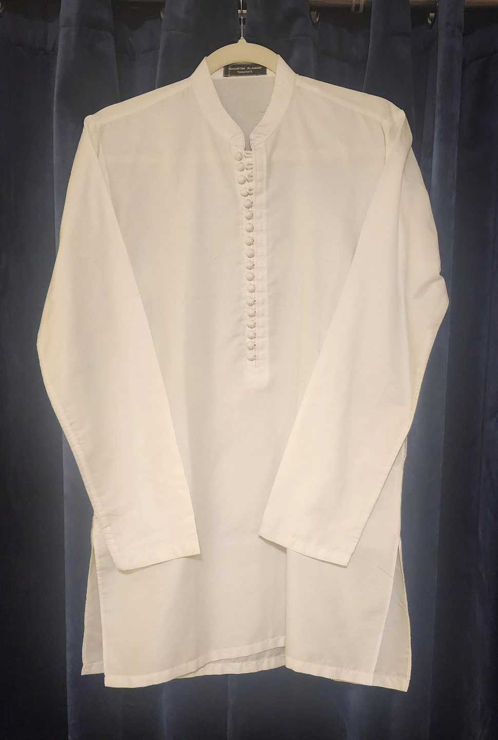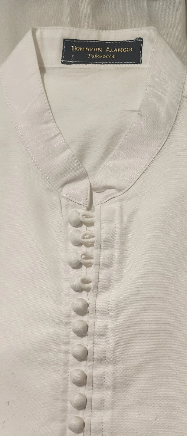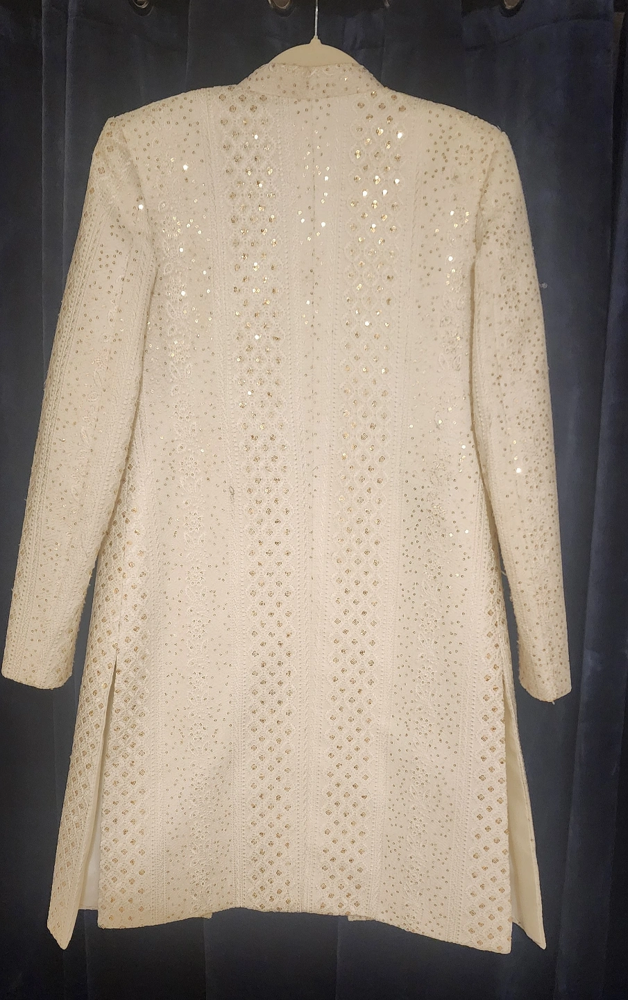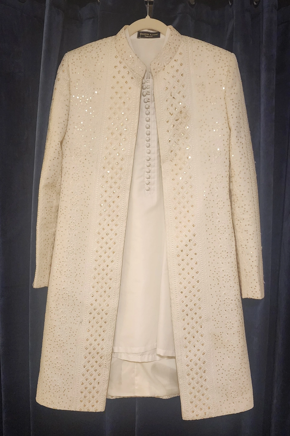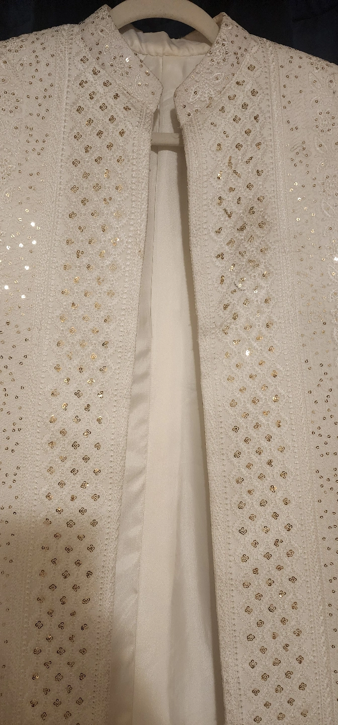 Stunning men's traditional outfit. Includes a long-sleeved kurta and matching embellished Sherwani Off-white colour. Beautiful detailing. Perfect for special occasions. Pajama included.