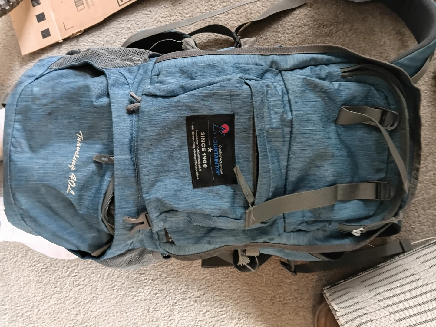 MOUNTAINTOP Traveling 40L backpack. Outdoor equipment designed for mountaineers. It's blue with grey accents and adjustable straps. Perfect for hiking trips!