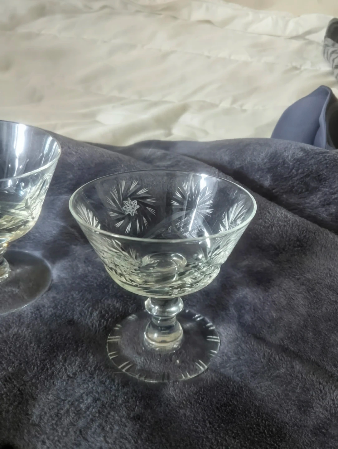 This is a set of four crystal glasses with an etched starburst pattern. They're perfect for serving small desserts or cocktails. Dishwasher safe.