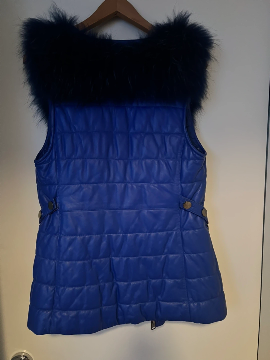 This is a stylish blue padded vest with a fur trim. It's in great condition and ready to add a pop of colour and warmth to your wardrobe. The quilted design and fur accents make it a unique piece