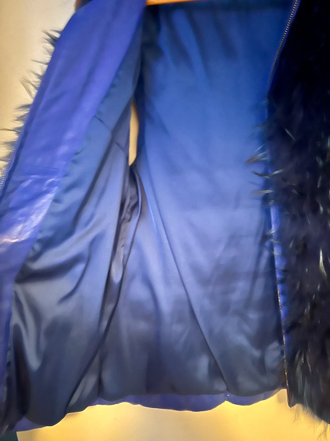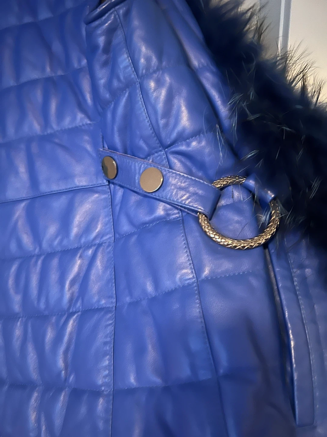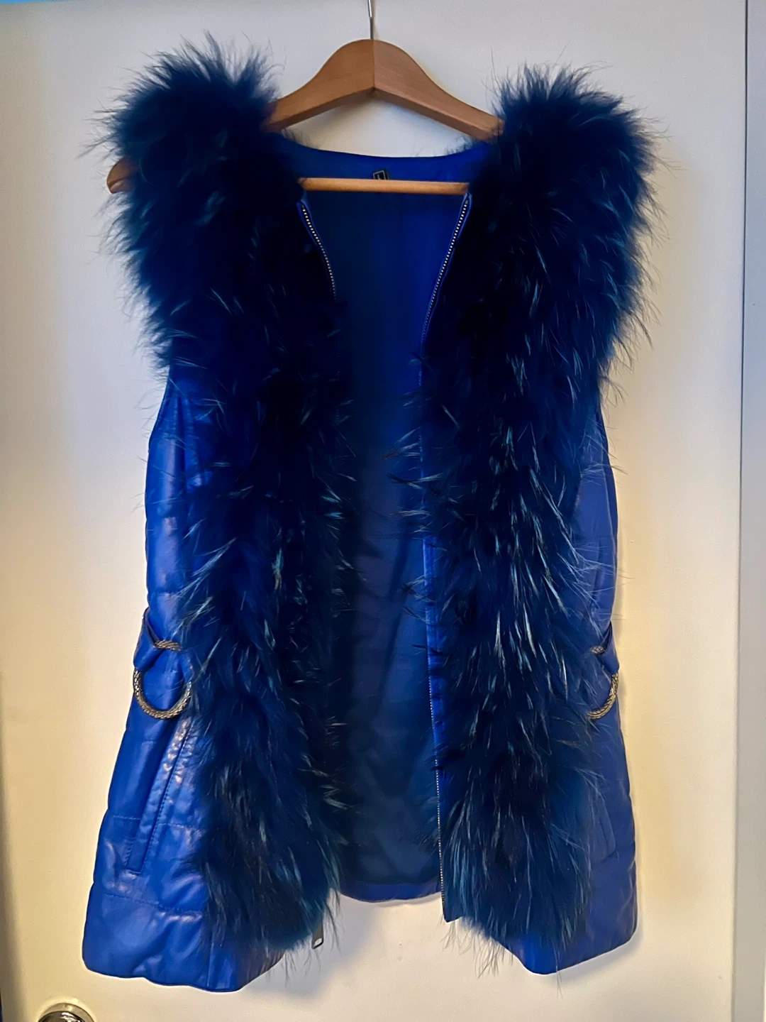 This is a stylish blue padded vest with a fur trim. It's in great condition and ready to add a pop of colour and warmth to your wardrobe. The quilted design and fur accents make it a unique piece