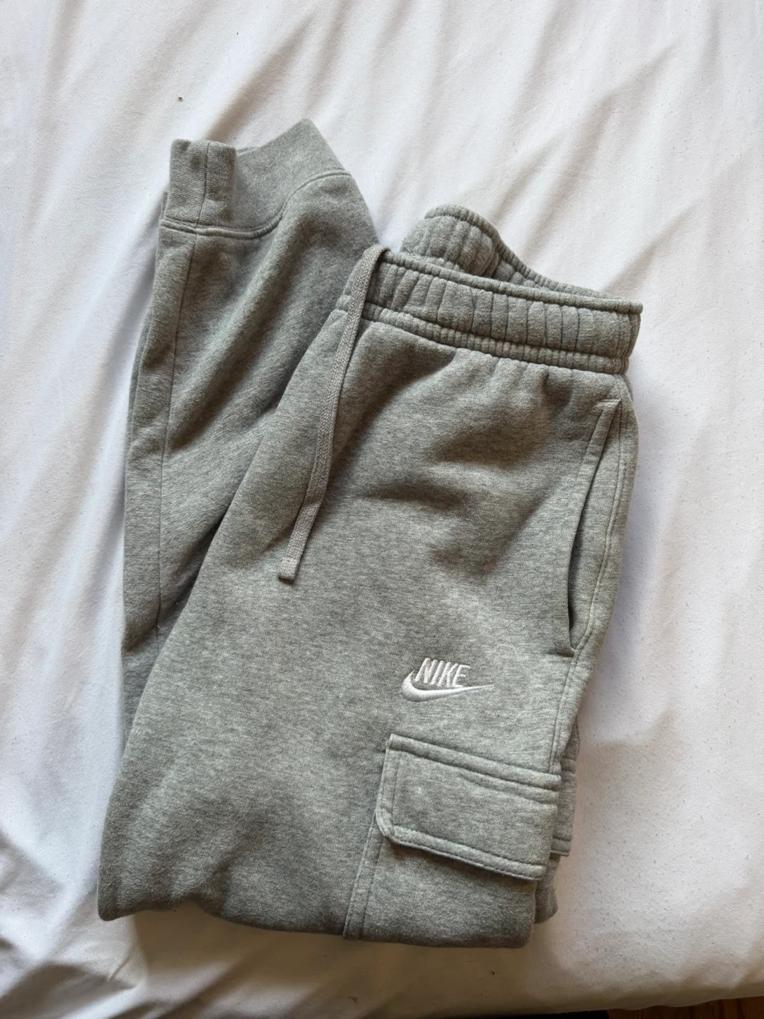 Comfy grey Nike sweatpants with cargo pockets. Made of soft fabric for all-day wear. Perfect for casual outings or lounging at home!