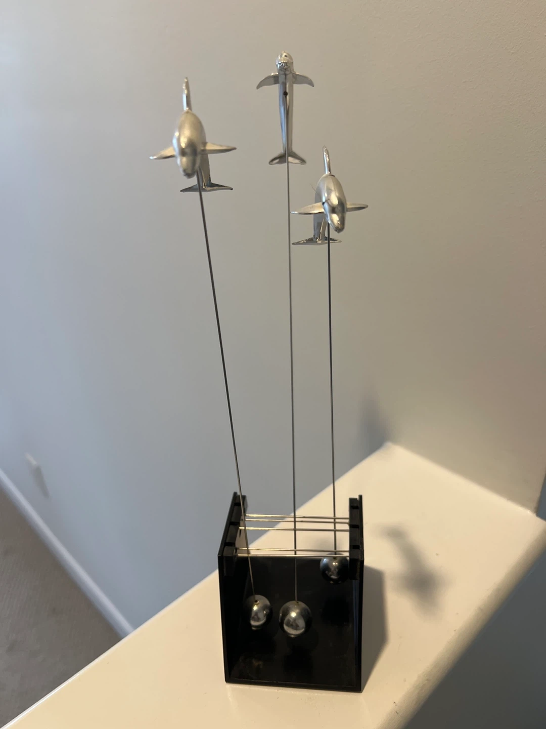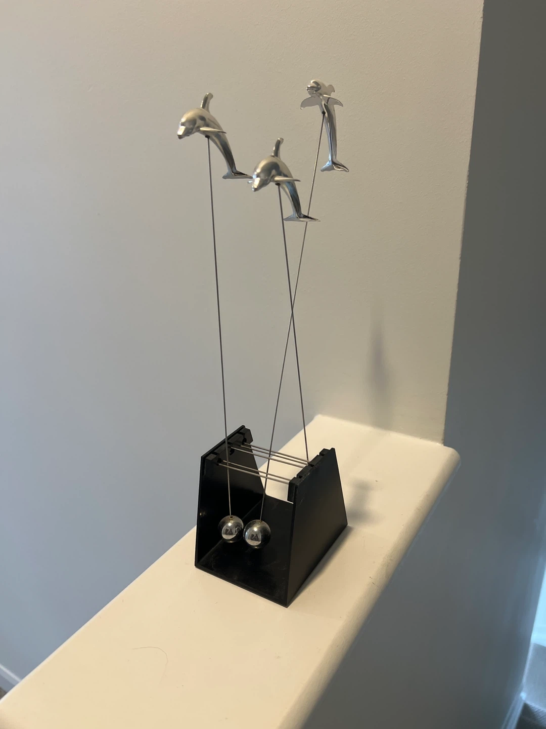 Here's a fun and unique Newton's cradle featuring dolphins! It's a great decorative piece and a cool way to demonstrate physics principles. It's in good condition and ready to add some whimsy to your space.