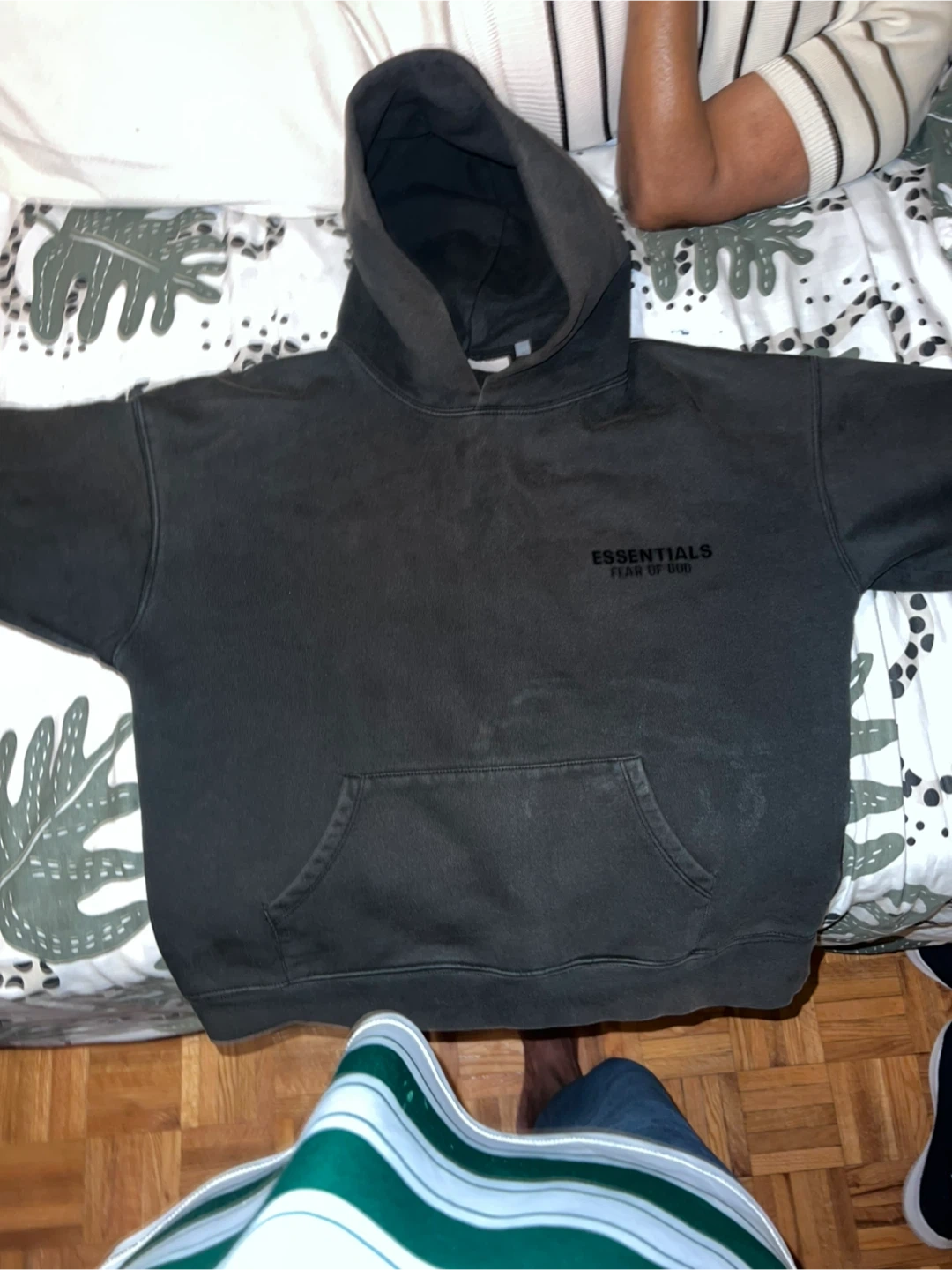 This is a grey Essentials Fear of God hoodie. It's a size small and made of 100% cotton. This hoodie is great for everyday wear.