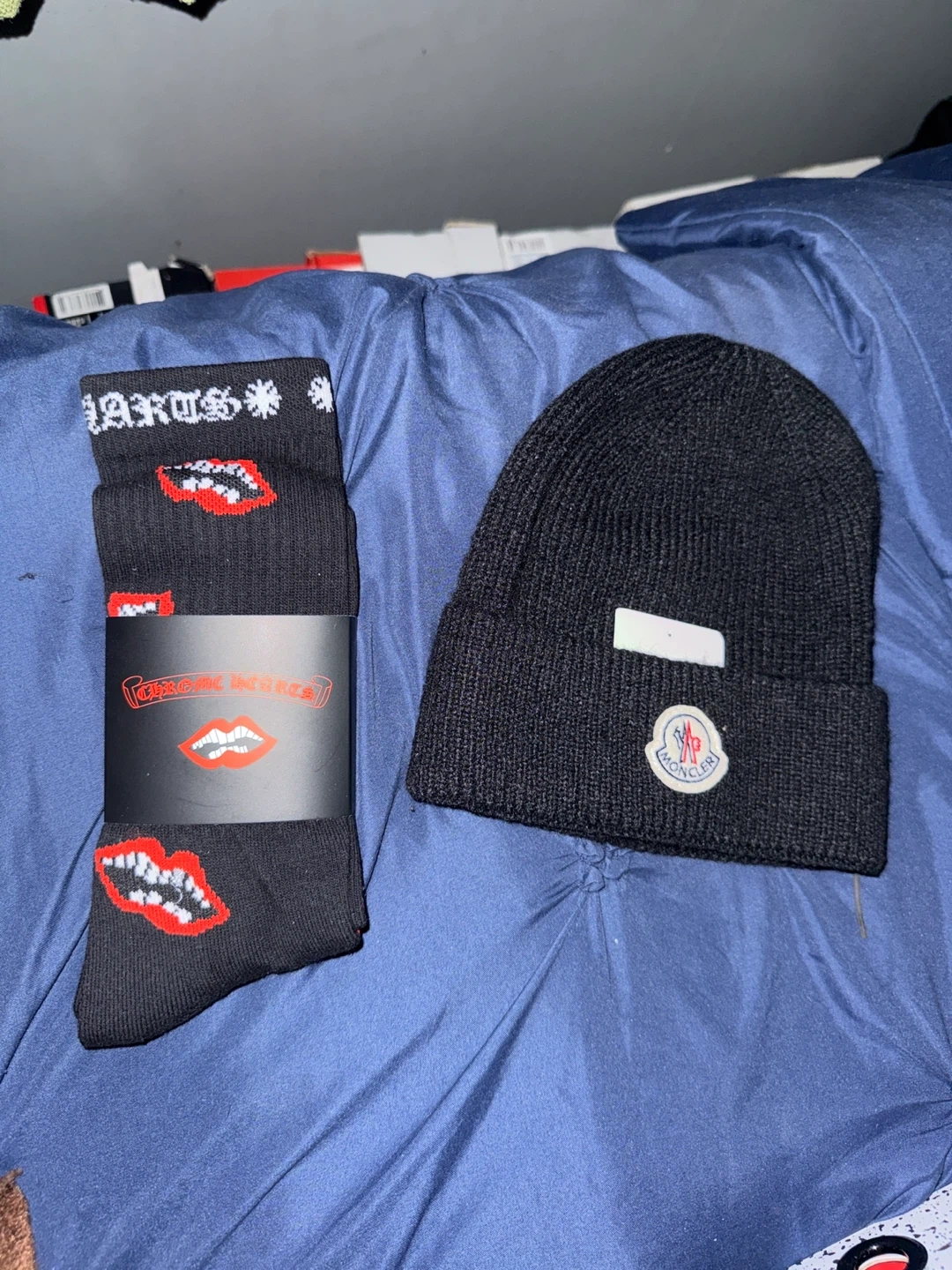 Moncler Wool and Cashmere beanie and Chrome Hearts socks with a lip design.