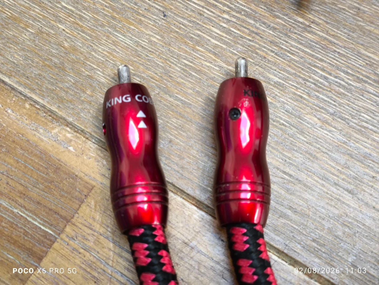 This is a King Cable RCA audio cable. It features a red and black braided jacket. The connectors are shiny red with gold tips.