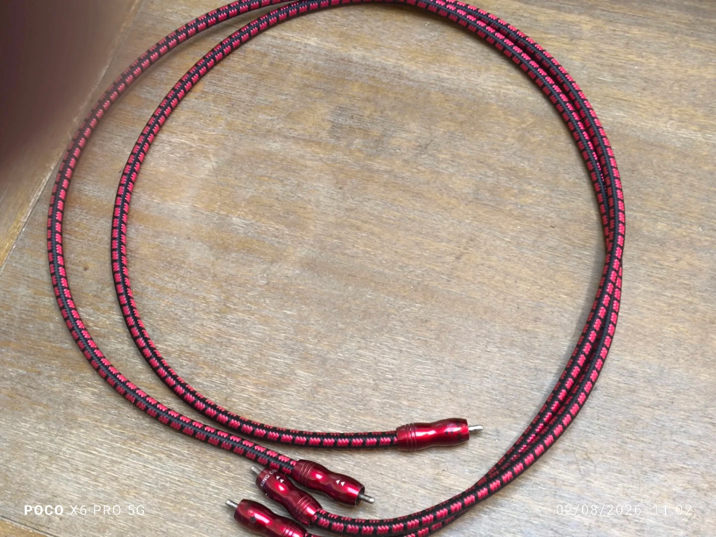 This is a King Cable RCA audio cable. It features a red and black braided jacket. The connectors are shiny red with gold tips.
